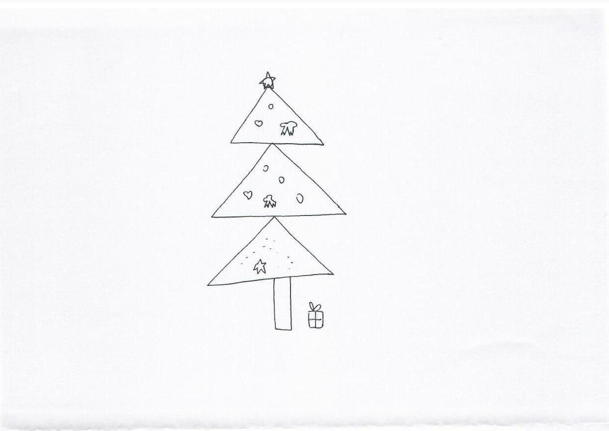 图中的圣诞树由简单的几何图形构成,饰有小星星、心形和不规则圆形装饰,底部有一个小礼盒。整体风格极简,线条手绘感强烈,展现出一种天真童趣的氛围。虽然缺少具体的宠物用品与互动细节,但可通过添加宠物角色和更多圣诞元素进行扩展。