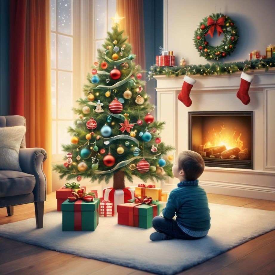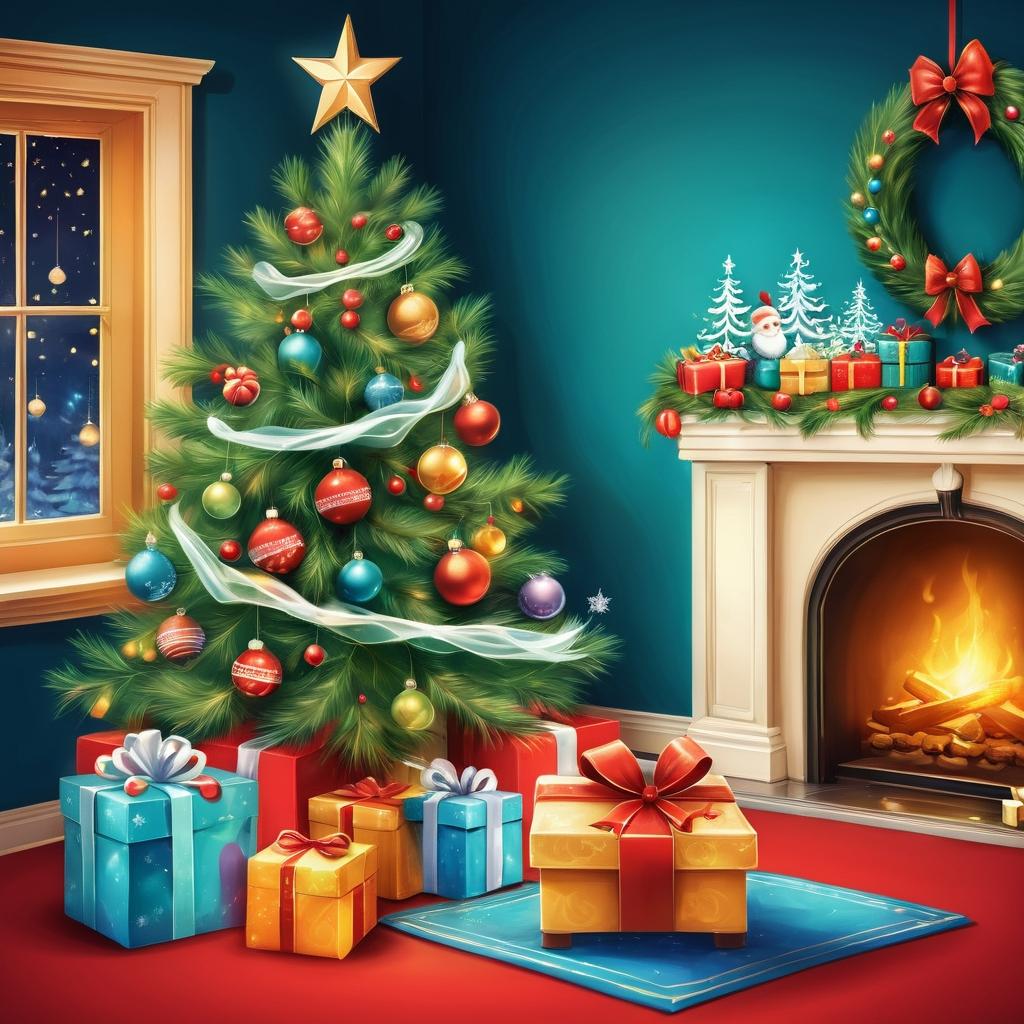 将这幅图中的几何结构发展为一棵装饰华丽的圣诞树,树上挂满了五颜六色的装饰品和闪烁的灯串。背景可以延展为一个温馨的家庭场景,有宠物和孩子在树下围坐,互相分享节日礼物。宠物可以戴上小小的圣诞帽,增添趣味性。