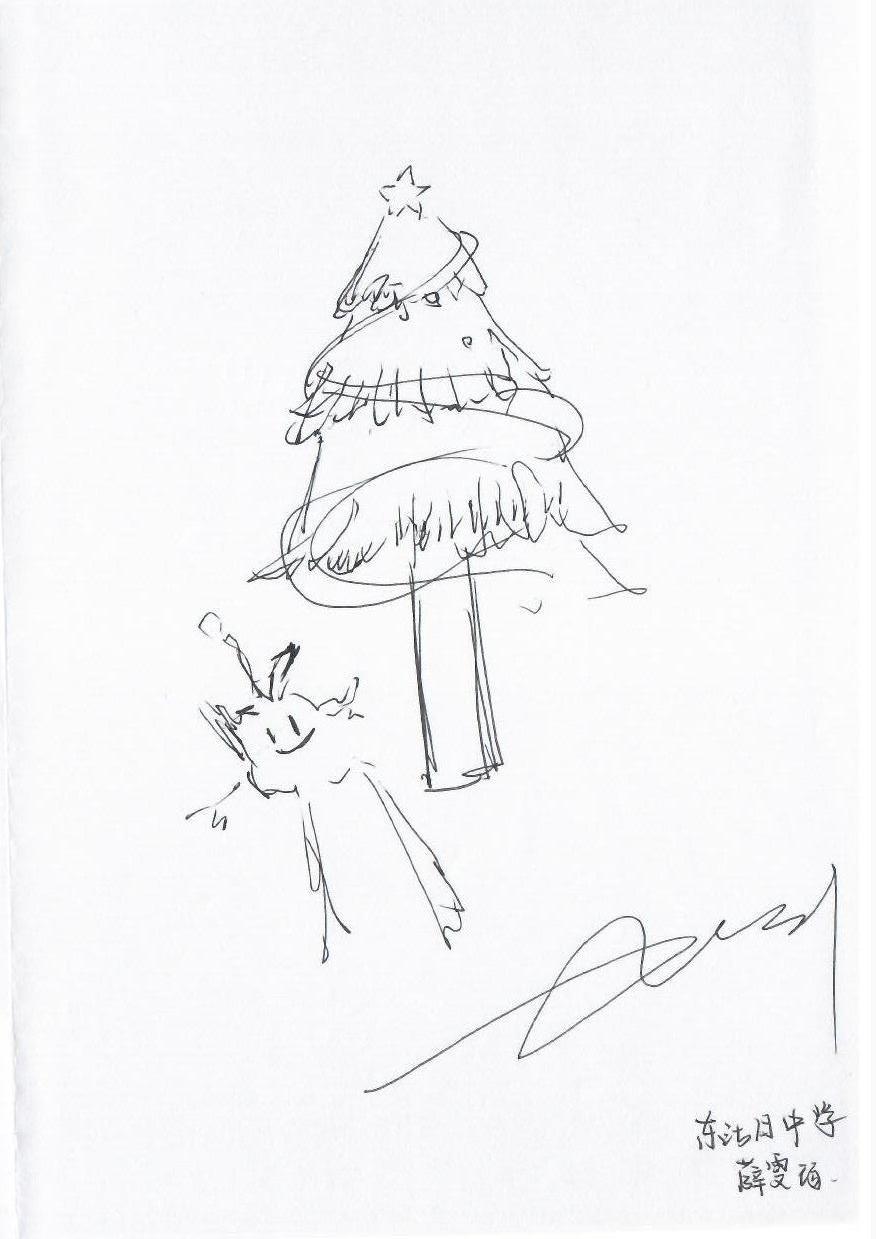 这幅画作采用了简单的线条勾勒出圣诞树和鹿的形象。圣诞树上有星星和层叠的树枝,鹿的形态流畅而活泼。尽管画作简约,但能感受到节日的氛围。整体风格偏向手绘,给人一种轻松和童趣的感觉。