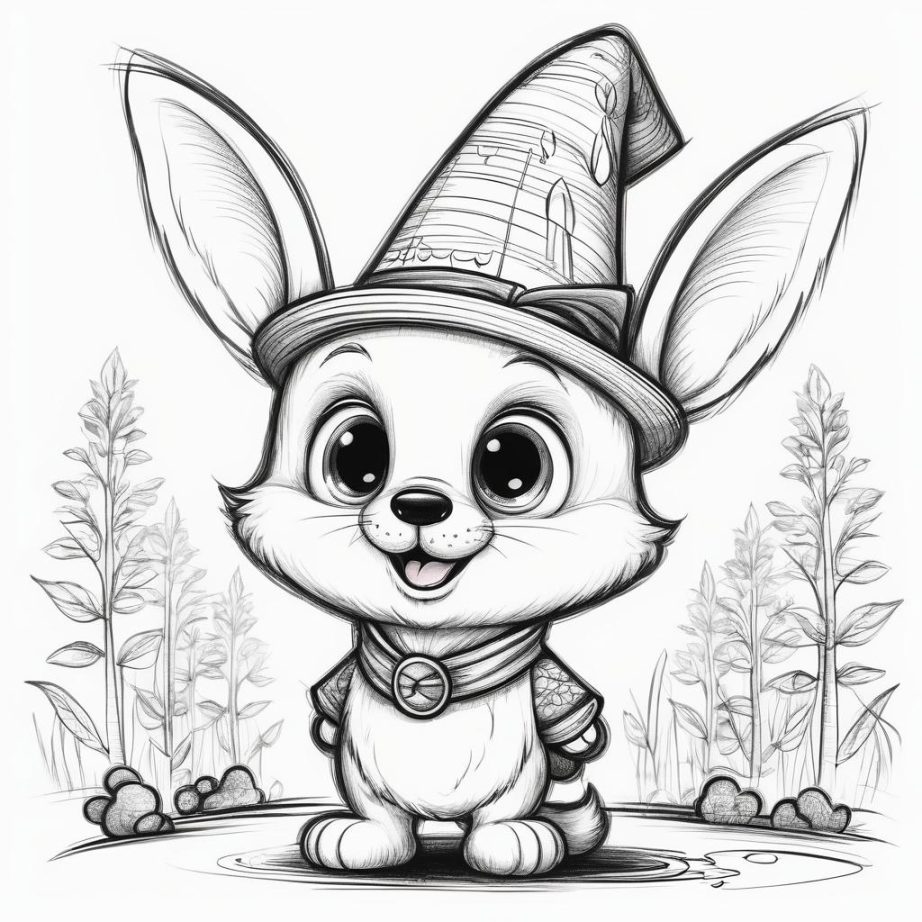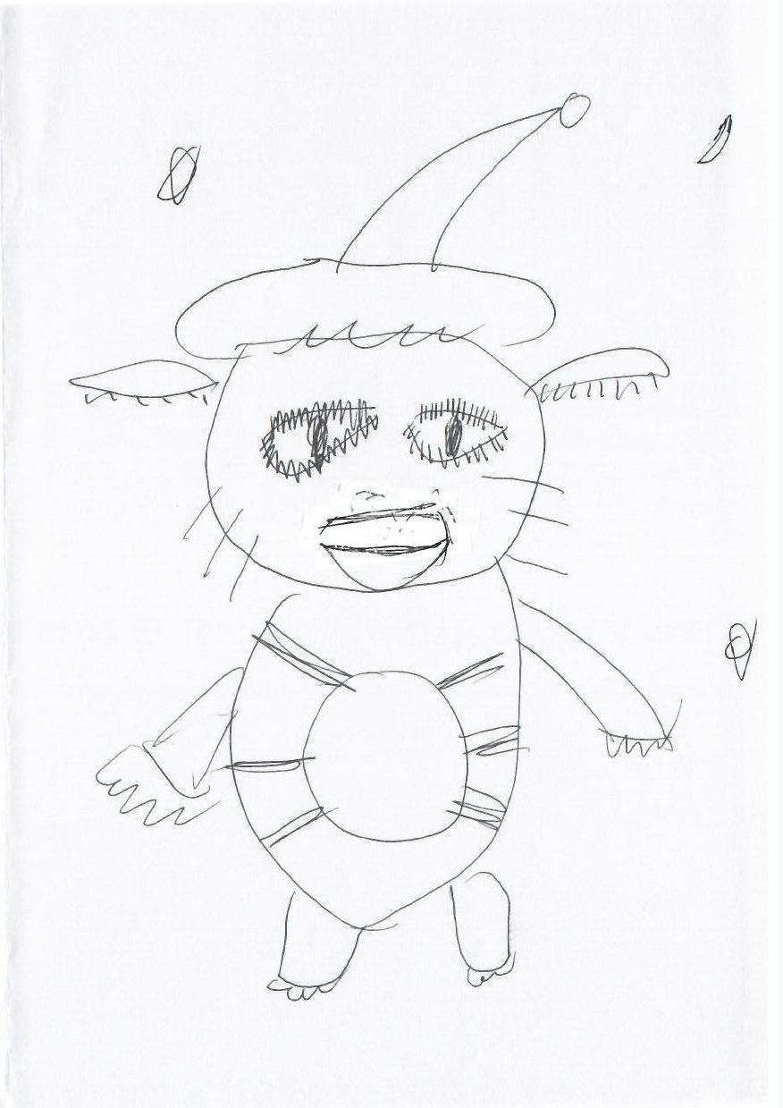 这幅作品是一幅简单的线条画,描绘了一只带有耳朵和圆形身体的卡通角色,头戴尖顶帽子,五官夸张。整体风格简洁,线条粗犷。作者可能试图通过夸张的五官和配件传达一种童趣和幽默感。