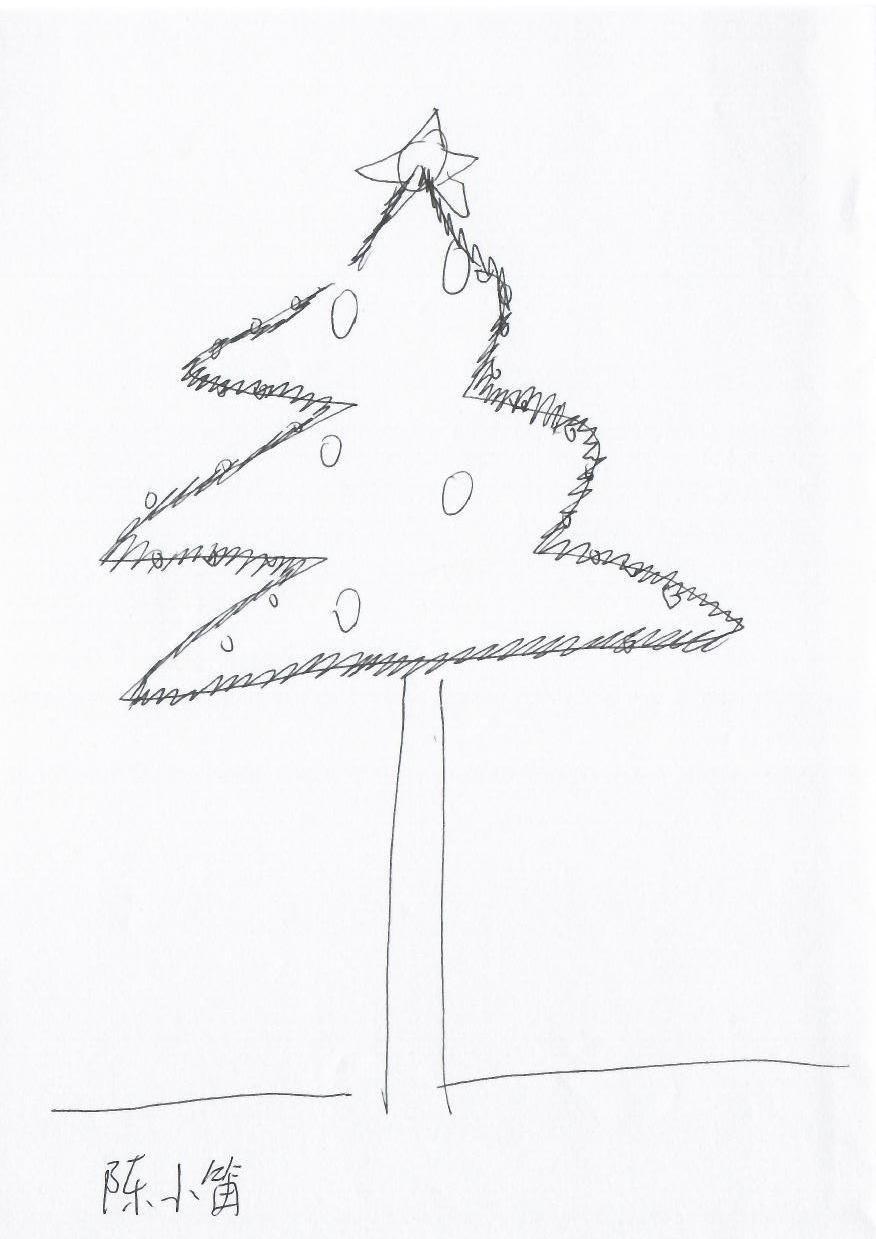 这幅作品是一幅简单的线条画,描绘了一棵圣诞树。主要元素包括树的轮廓、装饰的圆形物体以及树顶的星星。整体构图简约,给人一种轻松和天真的感觉,可能传达了一种纯粹的节日喜悦。