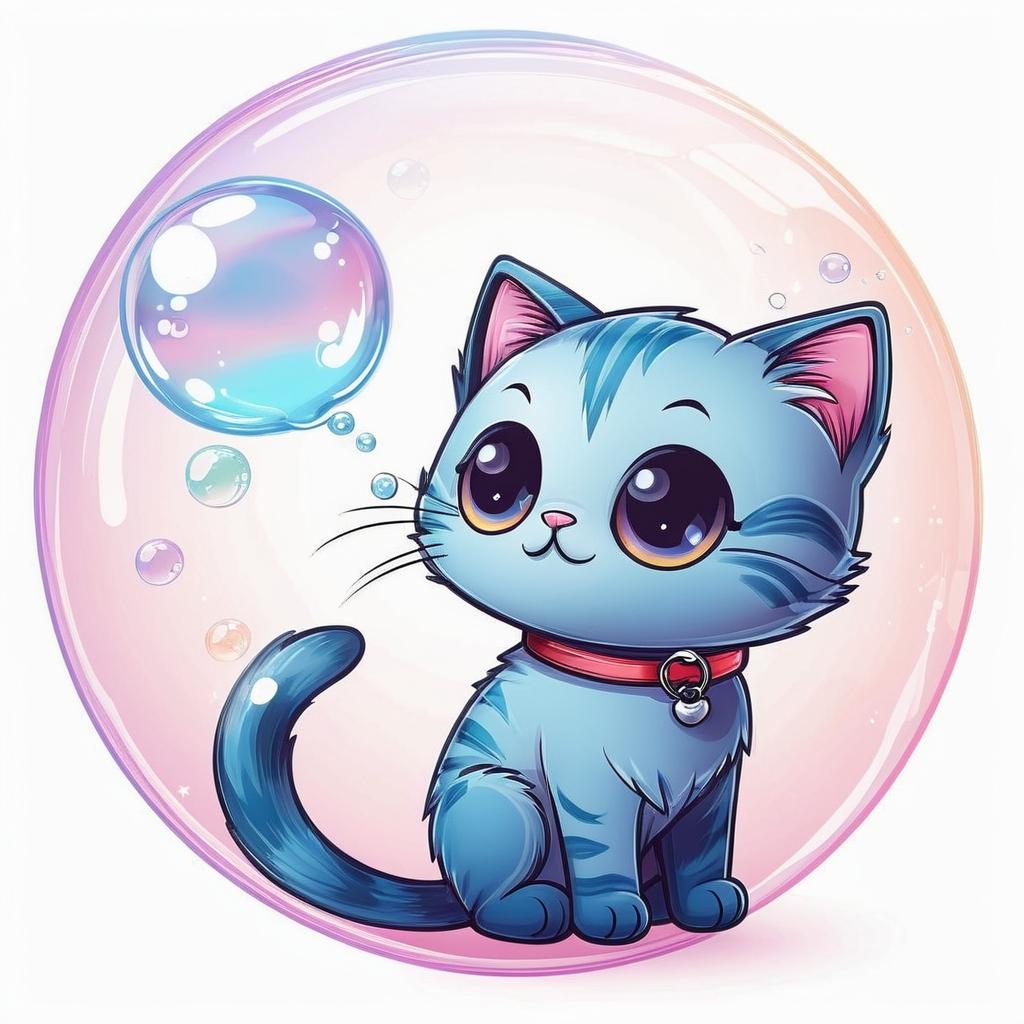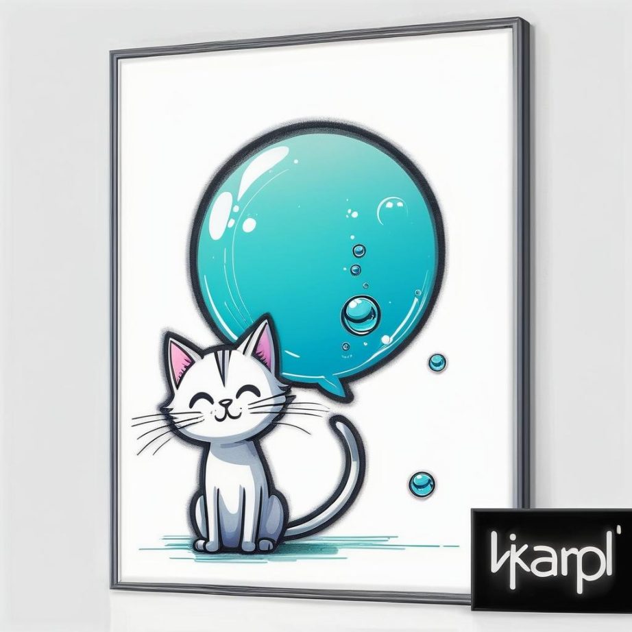 这幅画描绘了一只可爱的卡通猫,神情专注地看着一个装有鱼的泡泡。画作使用了简单的线条和图形,给人一种轻松和愉悦的感觉。画面中猫的表情和泡泡中的鱼传达了一种期待和渴望的情感。