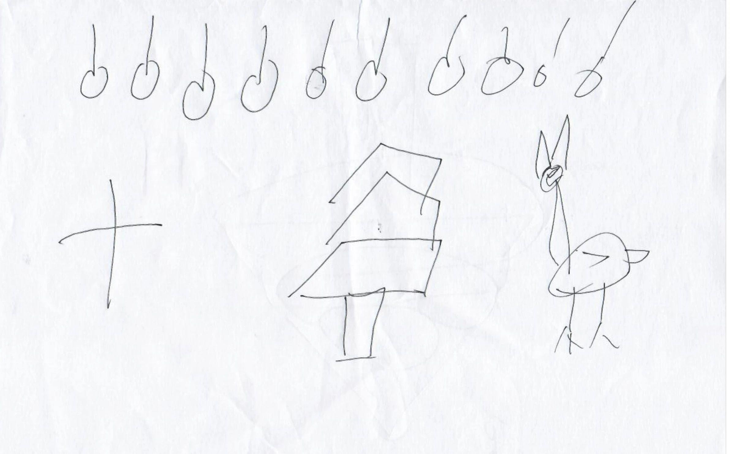 这幅作品主要由简单的线条和几何形状构成,包括一个十字、几组类似音符的符号、一个房屋的简化轮廓和一个类似动物的形象。整体布局随意,可能传达了一种轻松、自由的情绪。