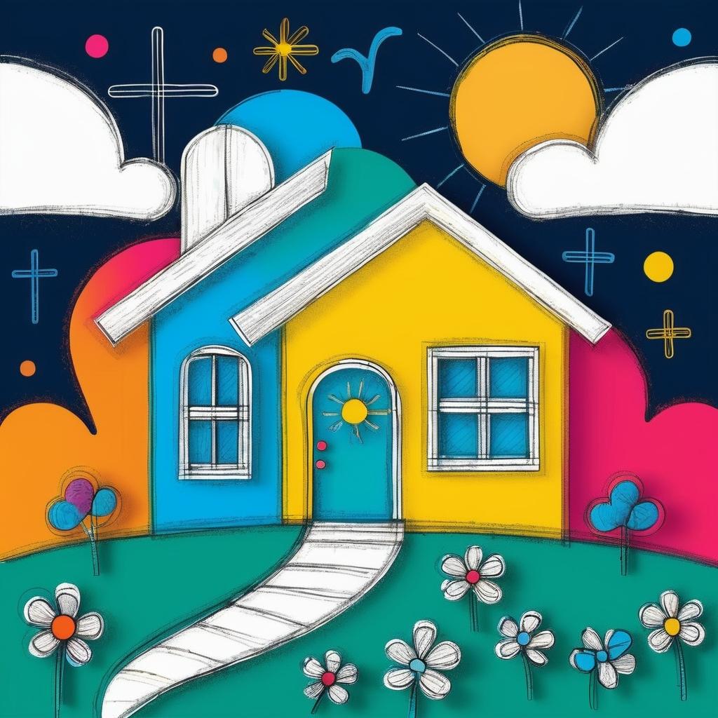 这幅画作以其简单的线条和几何形状,呈现了一个充满童趣和想象力的视觉世界。画面中的元素,如十字、音符状符号、房屋轮廓和动物形象,虽然简单却富有表现力,仿佛是一场孩童的艺术游戏。通过这些稚拙的线条,创作者似乎在探索一种纯粹而自由的表达方式,不拘泥于现实的框架,而是让想象力自由驰骋。这种风格让人联想到保罗·克利(Paul Klee)和原始艺术(Naïve Art)的影响,这些艺术家常常通过简单的形式和色彩传达深刻的情感和思想。为了提升这幅作品的艺术价值,可以在保持其童趣的基础上,加入更多的背景元素,比如抽象的云朵或太阳,以增加画面的深度。同时,通过丰富的色彩运用,如明亮的色调或渐变效果,可以让画面更加生动。这样的改进不仅能提升视觉吸引力,也能赋予作品更多的解读可能性,使其在艺术领域中更具辨识度和情感共鸣。