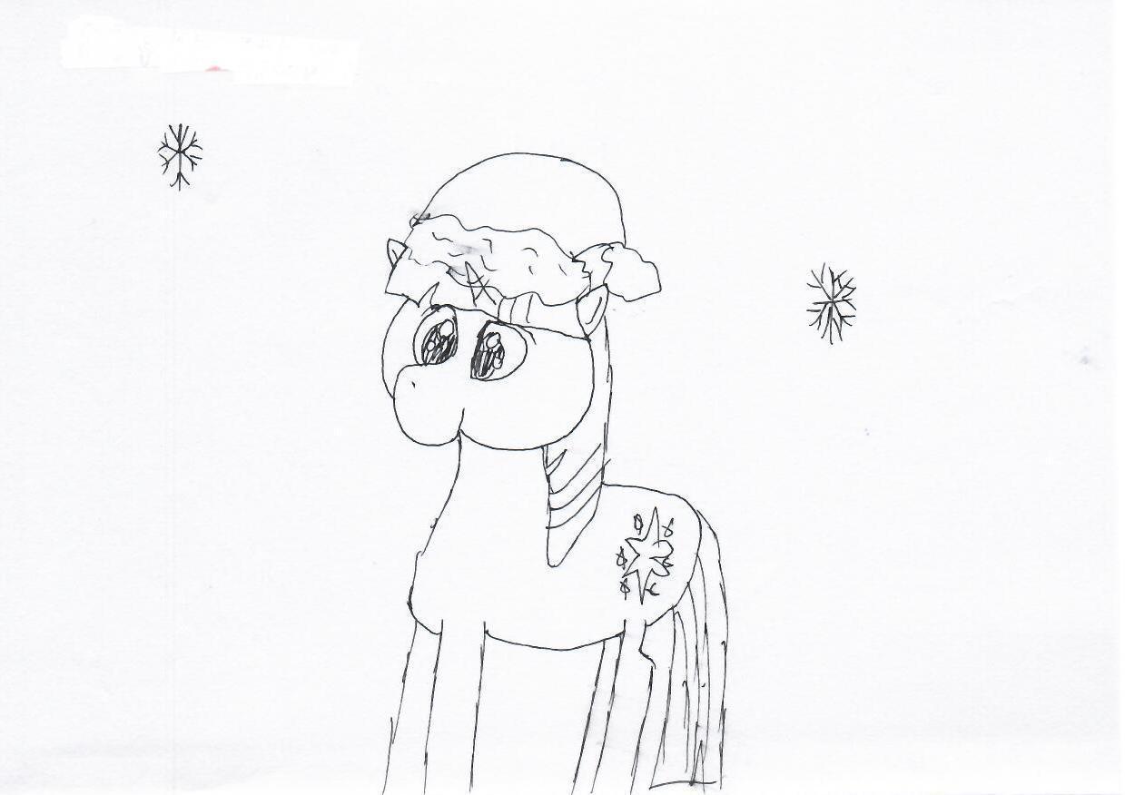 这幅图是一幅简单的线条画,描绘了一只卡通风格的小马,头戴圣诞帽,背景中有几片雪花。整体线条简洁,人物形象生动,具有童趣。创作者可能想传达一种冬季节日的欢乐气氛。
