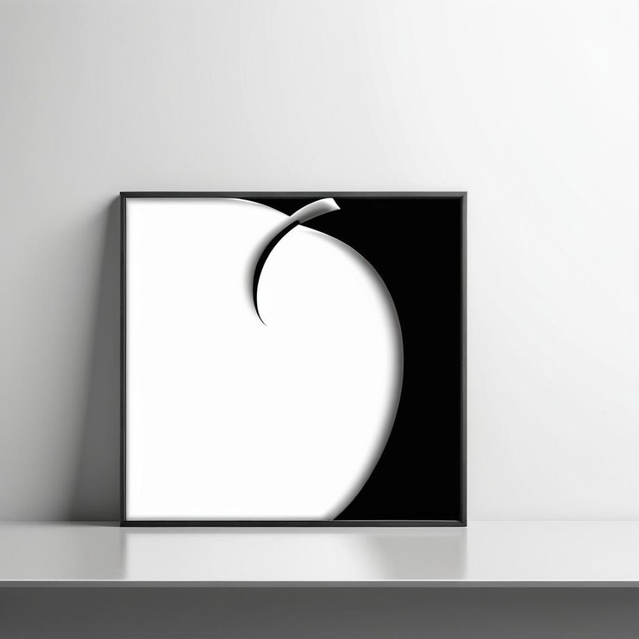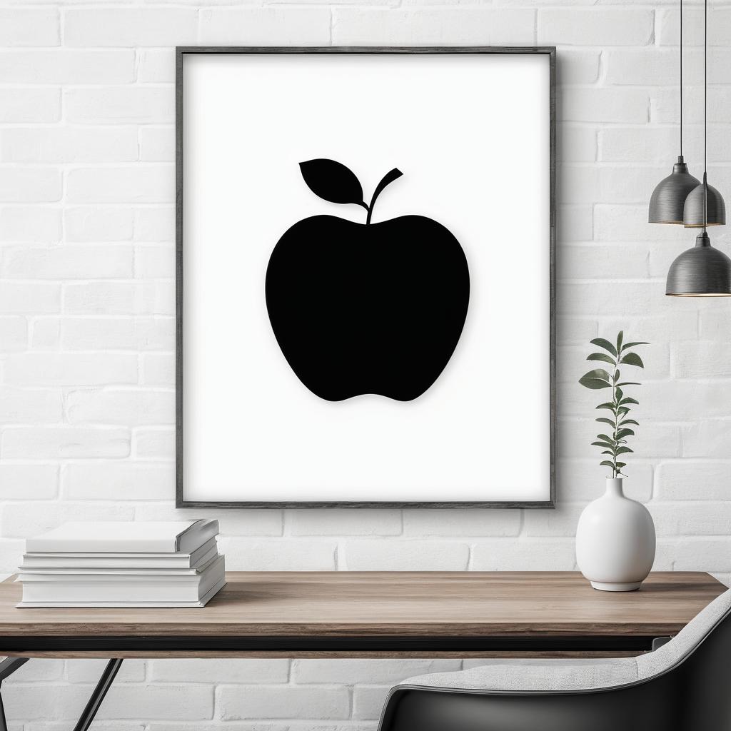 这幅作品以极简主义的方式呈现,主要元素是一个简单的黑白线条勾勒的苹果,位于画面的右下角。空白的背景给人一种宁静和空间感,可能传达了关于简约美学或内心沉思的主题。