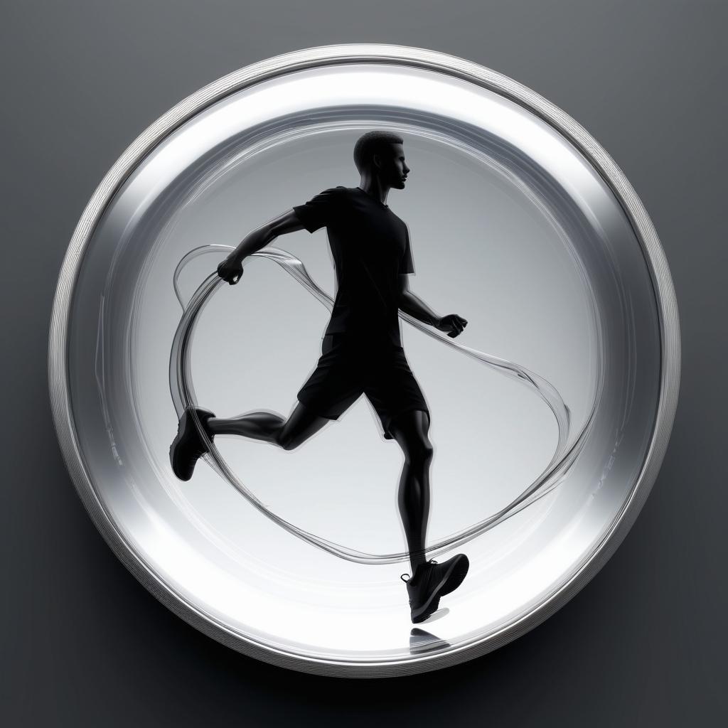 這幅作品主要由一個手繪的火柴人和一個透明容器組成,背景是金屬質感的圓形物體。整體顏色以冷色調為主,突顯出一種現代工業風格。畫面中火柴人似乎在運動,可能代表一種探索或逃避的情感。