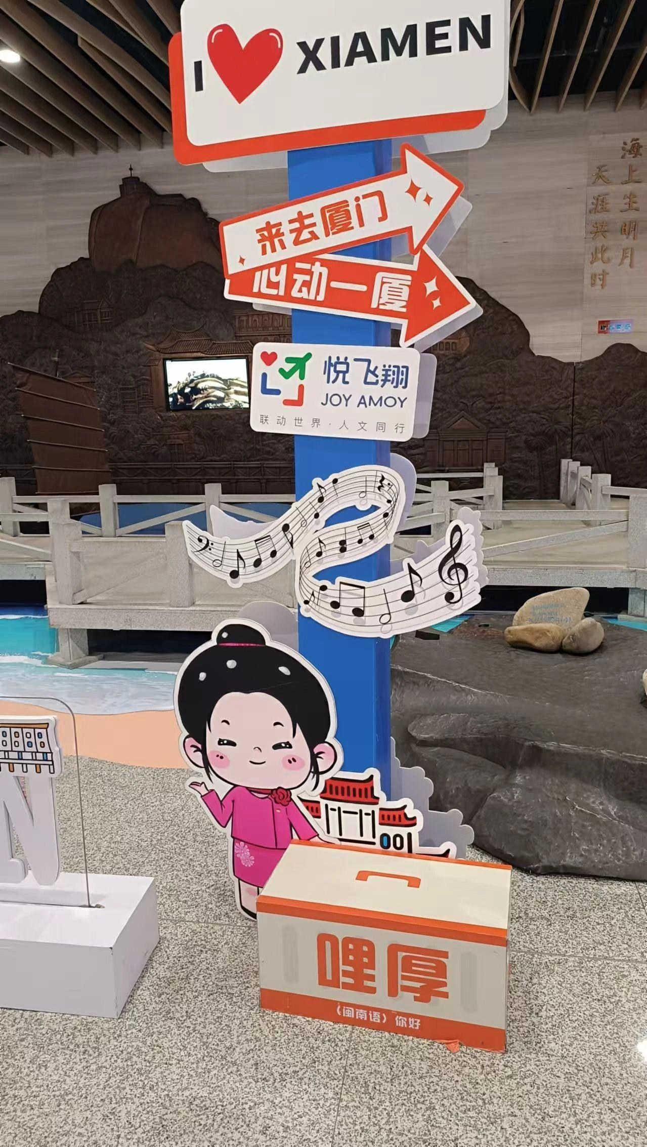 这幅图片展示了一个充满活力的旅游宣传场景,包含了厦门的地标性符号和卡通人物。主要元素包括色彩鲜艳的标牌、音乐符号以及一个微笑的卡通人物,营造出一种友好和热情的氛围。背景中的传统建筑元素与前景的现代宣传标牌形成了对比,传达了厦门这座城市的历史与现代交融的特色。