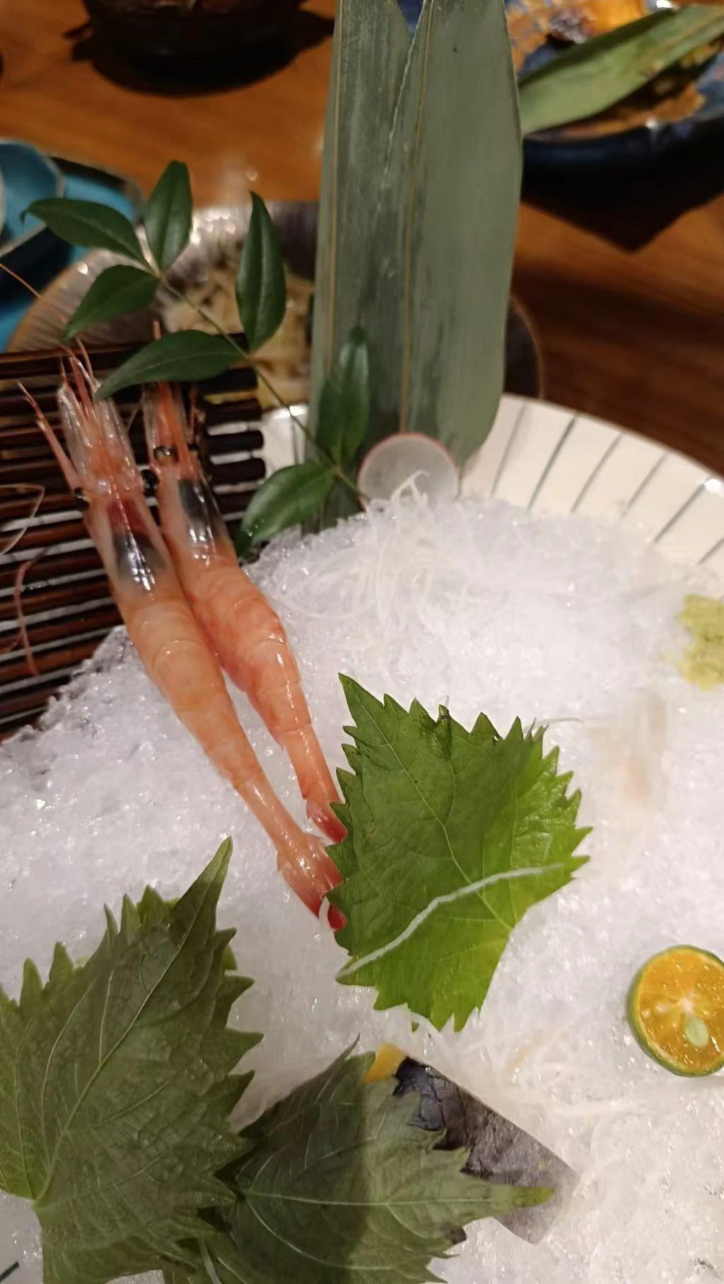 这幅作品展示了一道精美的刺身料理,主要元素包括新鲜的虾、绿色的植物叶子、冰块和切开的柑橘。画面中清新的绿色与虾的粉色形成对比,营造出清凉和自然的感觉。创作者可能想传达食材的新鲜与自然的美感。