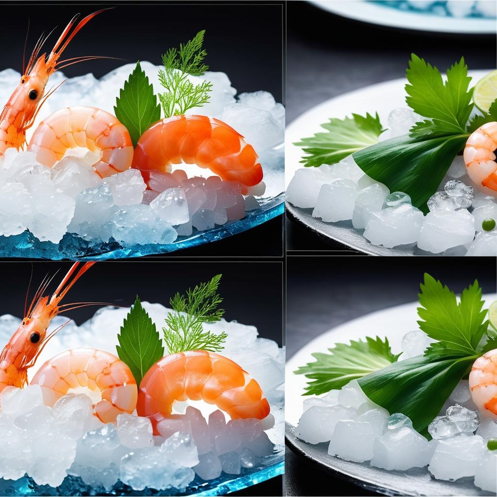 作为美食艺术评论家,我认为这幅作品不仅仅是对食物的展示,更是对自然与艺术结合的诠释。虾的透明感与冰块的晶莹剔透相得益彰,而绿色叶子的加入则为整个构图增添了生命力。创作者通过细致的摆盘和色彩搭配,将食材在观者面前如诗般呈现。