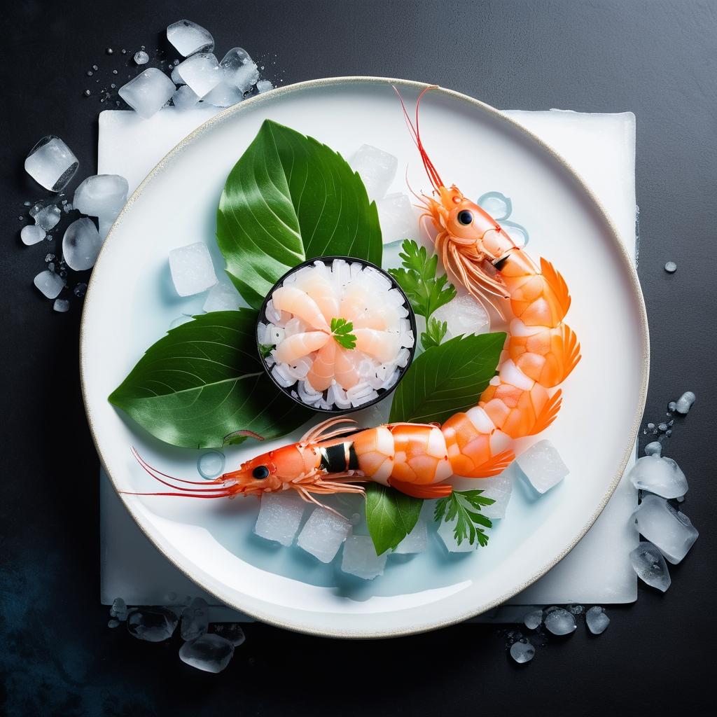 这幅作品巧妙地结合了食材的天然色彩与精致的摆盘艺术。虾的自然色泽和透明的冰块相映成趣,绿色的叶子为整个构图增添了生机。为了提升作品的艺术性,可以在背景中加入一些柔和的光影效果,使食材看起来更加立体和诱人。此外,可以考虑在冰块的形状和布局上进行更多的创意设计,例如将冰块雕刻成特定的形状,进一步增强视觉冲击力。通过这些调整,作品能够更好地传达食材本身的魅力和厨师的巧思。