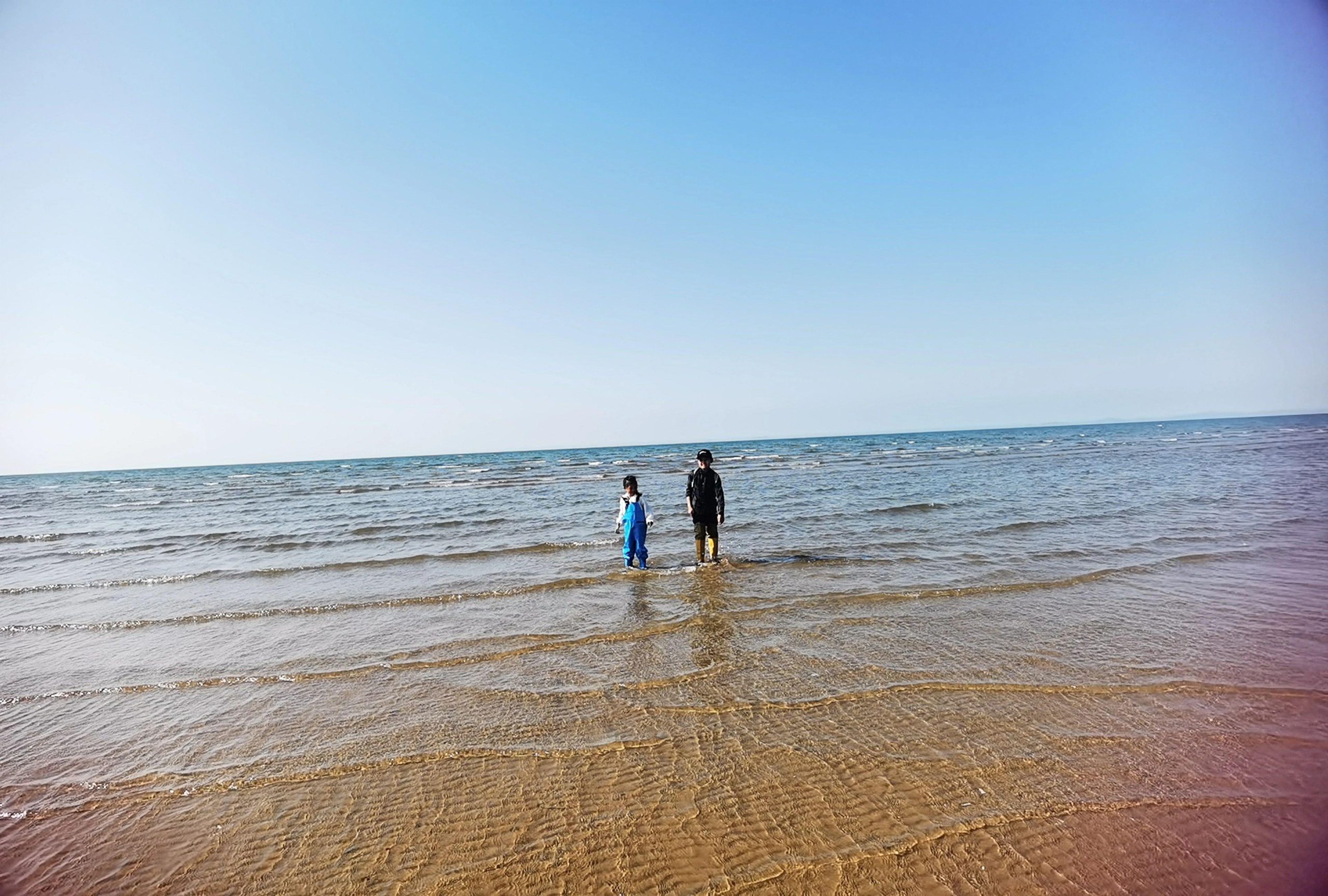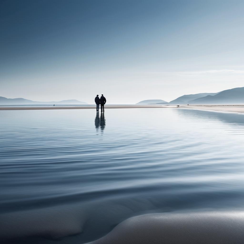 这幅作品通过简单而有效的视觉元素,传递出人与自然和谐共处的主题。画面中的两个身影站立在浅浅的海水中,背景是无尽的蓝天与海洋,给人一种宁静而放松的感觉。这样的构图选择,强化了自然的广阔与人类的渺小,令人反思人与自然之间的关系。为了进一步提升作品的艺术性,可以考虑加入一些动态元素,如飞翔的海鸥或远处的船只,以增加画面的层次感。这不仅丰富了视觉体验,也注入了生命的活力。同时,增强光影效果,使海水的波纹在阳光的映照下更加突出,能够创造出一种生动的视觉对比。此外,通过色彩的渐变表现时间的流逝,或者人物之间的细微互动,能更深刻地传达出自然环境中的故事性和情感共鸣。通过这些细节的调整,这幅作品能够在特定的艺术领域中更具辨识度和情感链接。