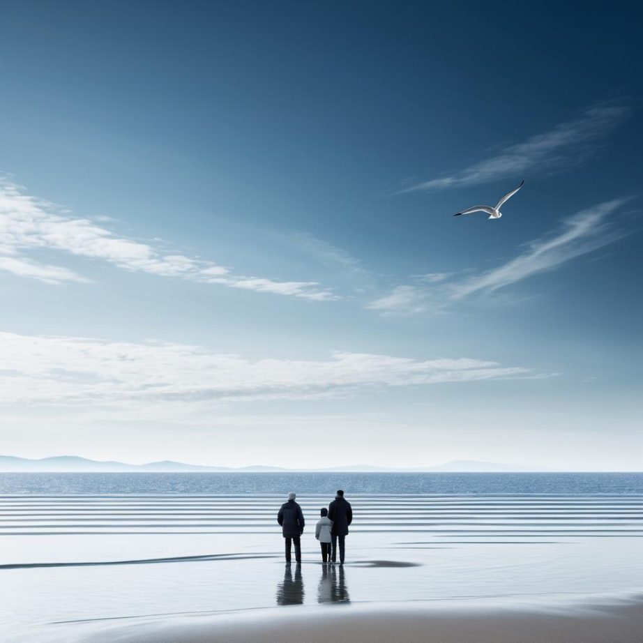 这幅作品呈现了两个站在海滩上的人,背景是广阔的蓝色天空和海洋。画面中的颜色主要是浅蓝色和沙滩的金黄色,构图简单,给人一种宁静和放松的感觉。创作者可能想传达人与自然和谐共处的主题。