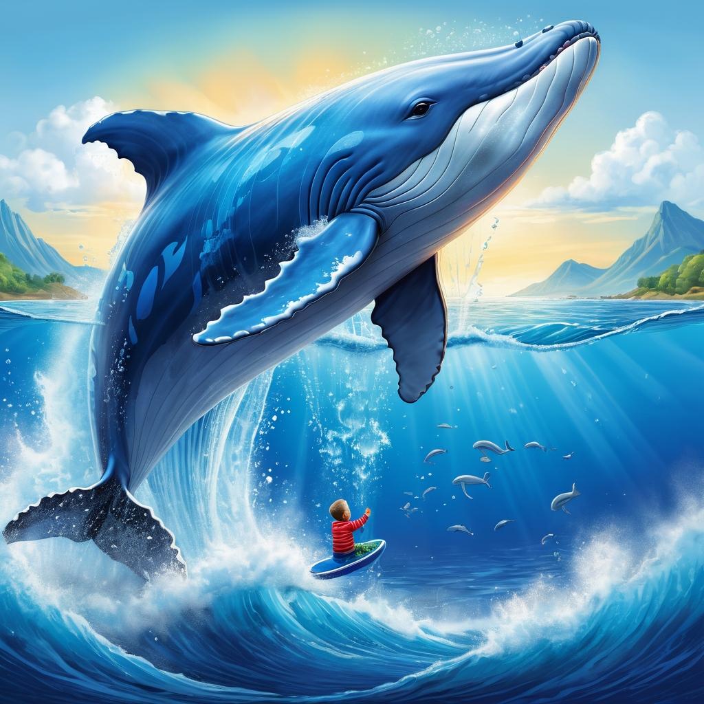 这幅作品是一幅简单而富有童趣的鲸鱼画。画面中以蓝色为主,鲸鱼的表情可爱,正在喷出水花。整体构图简洁明了,传达了一种轻松愉快的情感。