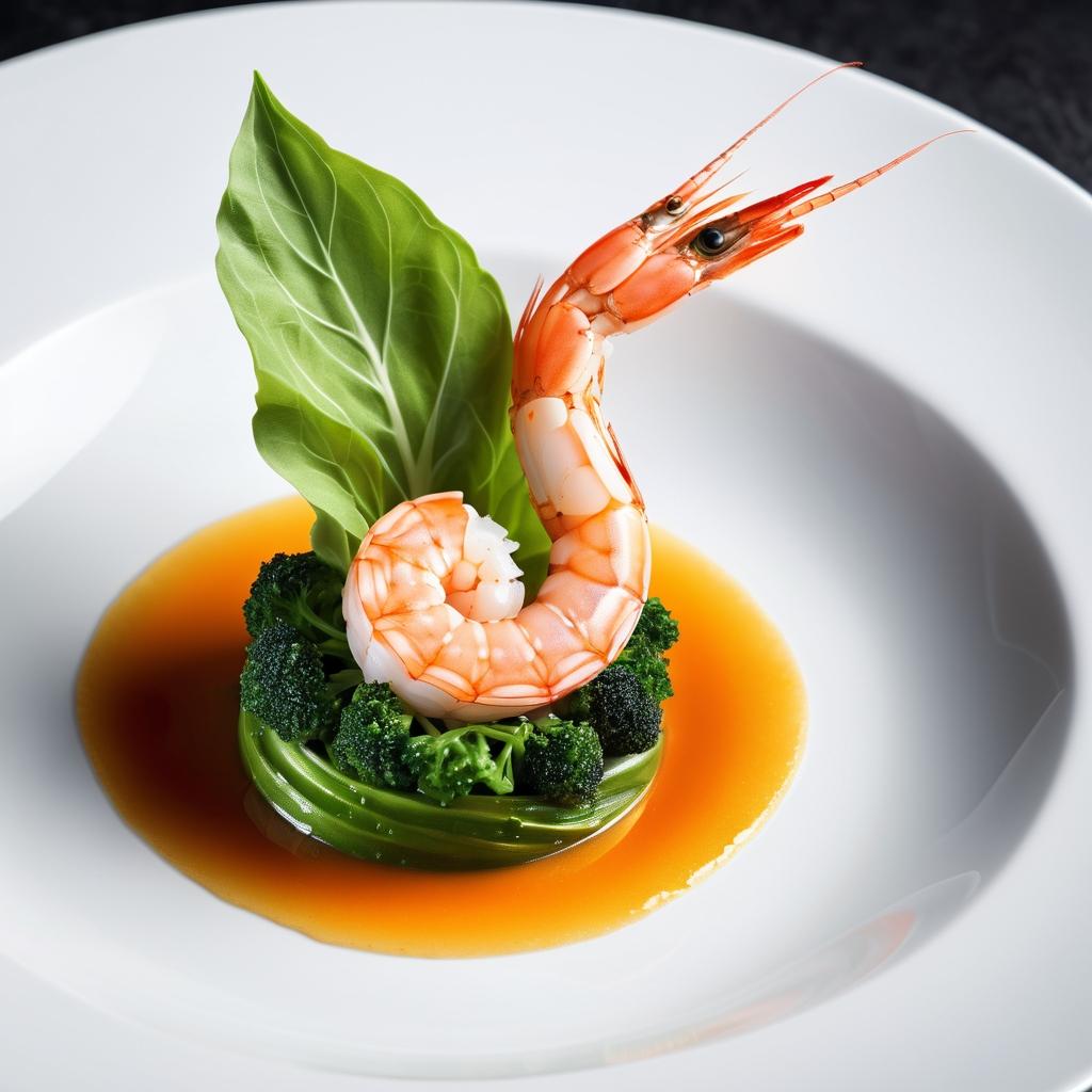 这道菜不仅仅是一顿饭,而是一场视觉与味觉的盛宴。它展示了现代美食艺术的精髓,通过色彩、质感和构图的巧妙结合,体现了厨师对细节的关注和对食材的尊重。绿色蔬菜的清新与虾的鲜红形成强烈对比,使人联想到自然的纯净与生命的活力。摆盘中的每一个细节都经过精心设计,体现了厨师对美学的理解与追求。在光影的照射下,食材的每一个纹理都被完美呈现,仿佛一幅静物画。背景的简洁使得菜肴成为视觉焦点,增强了整体的艺术性。这样的作品不仅仅是食物,更是一种生活方式的表达,展示了对美好事物的追求和对生活的热爱。