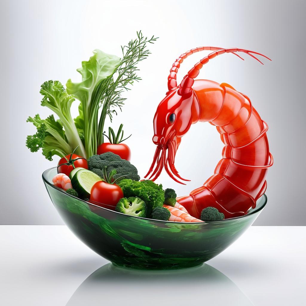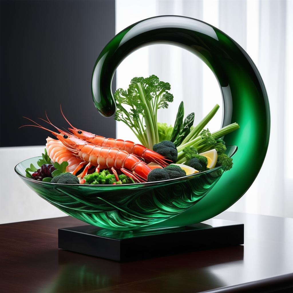 这幅作品以一道精美的菜肴为主题,通过色彩和层次的巧妙运用展现了食材的美感和厨艺的艺术性。虾的鲜红与蔬菜的绿色形成强烈对比,营造出一种视觉上的冲击力,同时也传递出一种自然的和谐美。通过将这种视觉元素转化为雕塑设计,我们可以探讨如何在雕塑中表现出同样的色彩对比与层次感。雕塑可以采用不同材质,如抛光石材和磨砂玻璃,以展现食材的质感和光泽,捕捉菜肴中蕴含的自然美感与文化背景。这样的设计不仅在形式上实现了艺术与功能的统一,也在情感层面上引发观众对饮食文化的深刻共鸣。
