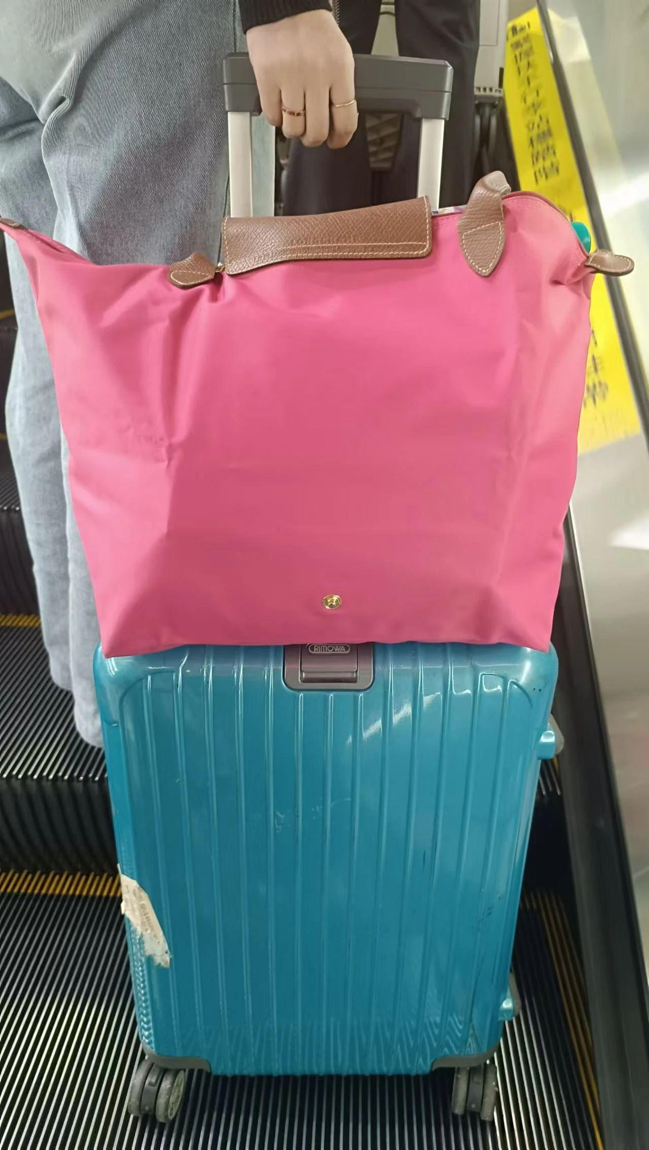 这张图片展示了一只手握着行李箱的把手,行李箱上方放置了一个粉色的包。人物的手部特写和行李箱的色彩是图中的主要元素。画面缺乏直接的圣诞元素,因此可以通过添加节日装饰来营造圣诞氛围,如在行李箱上添加圣诞贴纸或用圣诞灯饰环绕。