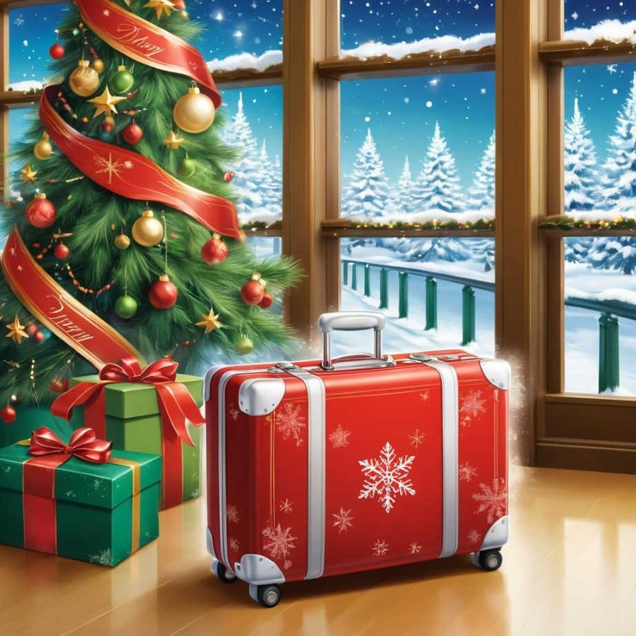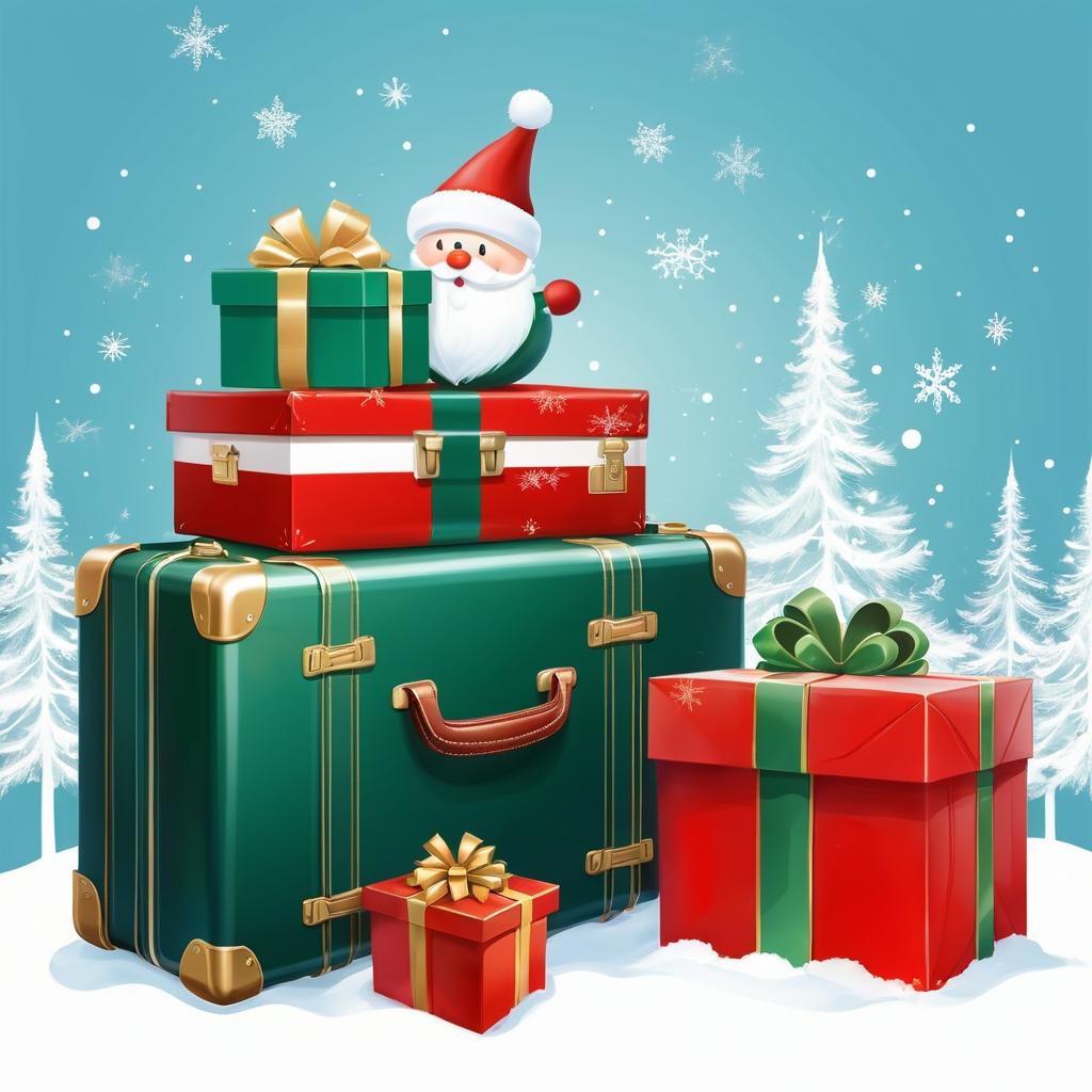 可以将人物手部的姿态作为情感核心,表达旅行与团聚的主题。行李箱与旅行相关,可以增添节日旅行的元素,如在背景中加入雪花飘落、圣诞灯饰和挂满灯光的圣诞树,传达回家过节的温馨和期待。