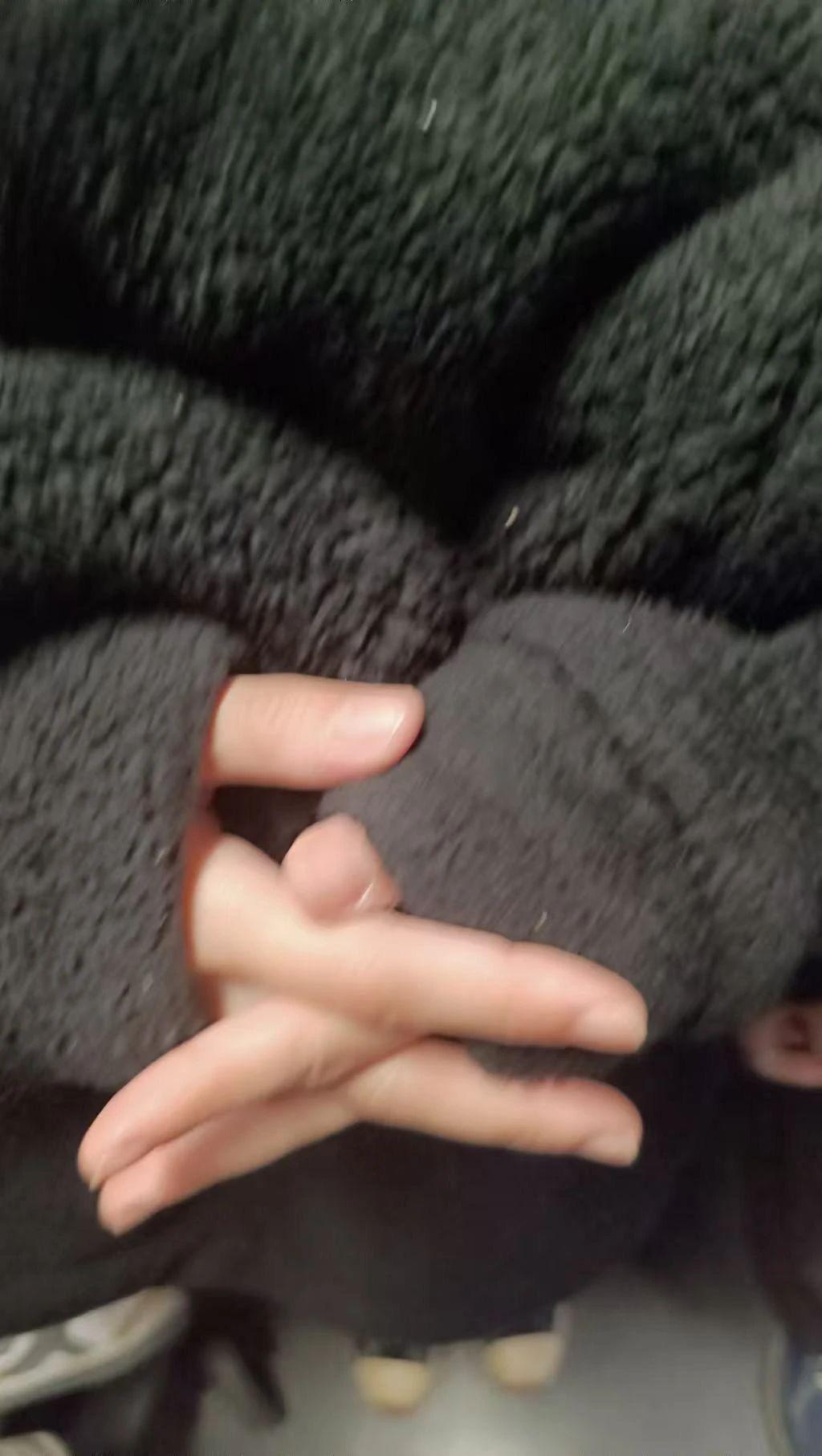 这张图片以近距离拍摄为主,展示了一个人用毛绒外套包裹着的手部姿态。人物特征主要集中在手部的姿势和衣服的材质,整体色调较为单一,缺乏明显的节日元素和色彩。图像的光影效果柔和,构图集中在手部的细节。要转化为圣诞贺卡设计,可以考虑加入节日元素如圣诞灯饰、雪花等。