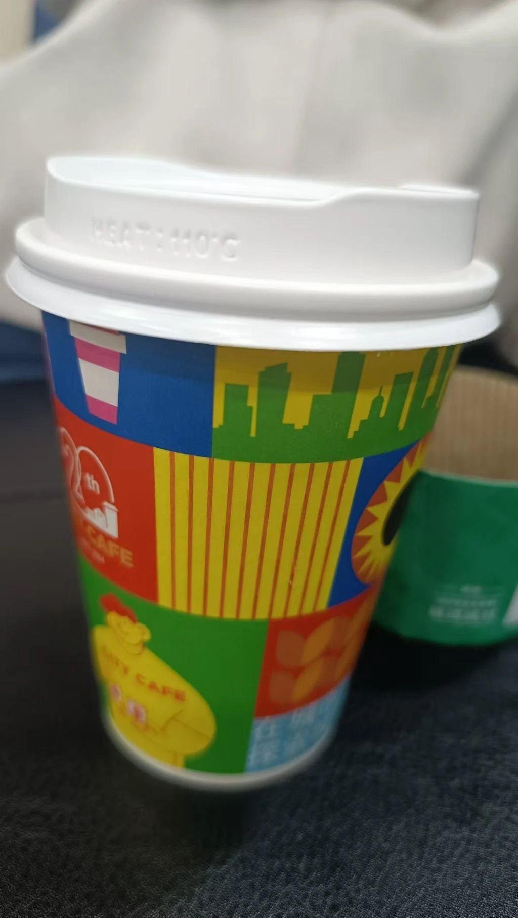 图片中展示了一只色彩鲜艳的纸杯,背景较为模糊。纸杯上的图案包括抽象的建筑剪影和几何图形,缺乏明显的节日元素。色彩运用上以蓝、红、绿、黄为主,充满活力与现代感。整体构图简单,光线均匀。
