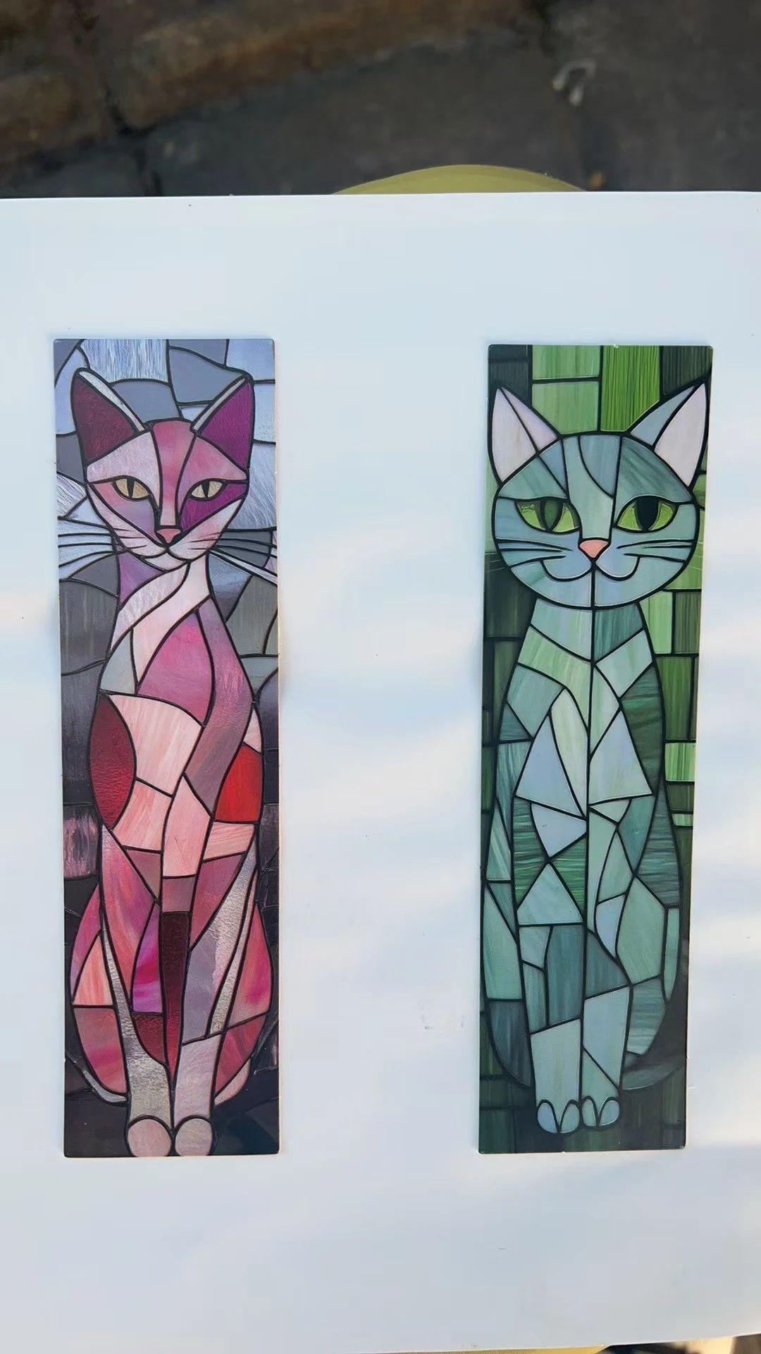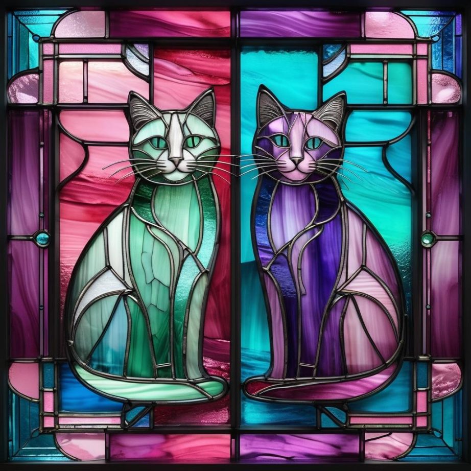 这幅作品展示了两只猫的彩色玻璃风格的绘画。左边的猫使用了粉色和紫色的色调,显示出一种温暖和神秘的感觉;右边的猫则采用绿色和蓝色,传递出一种宁静与自然的氛围。整体构图以几何形状为主,给人一种现代和抽象的视觉体验。创作者可能想通过这种方式表达动物的多样性以及色彩在情感传达中的作用。