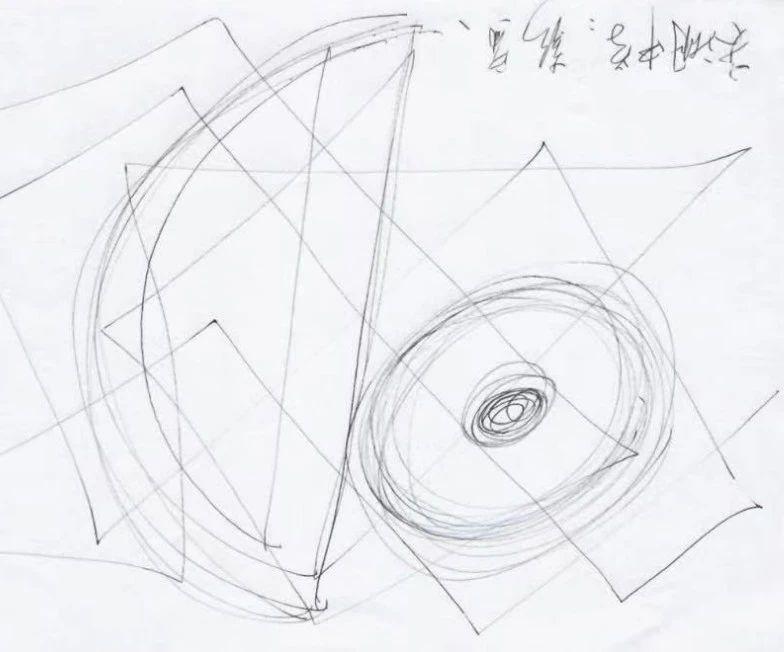 这幅作品以简单的线条和几何形状为主,表现出一种动态的视觉效果。线条交错,形成了多个重叠的几何图形,中心部分的圆形尤其突出,可能象征着某种中心或焦点。整体构图看似随意,但又有一种内在的秩序感,传达出一种探索或思考的意图。