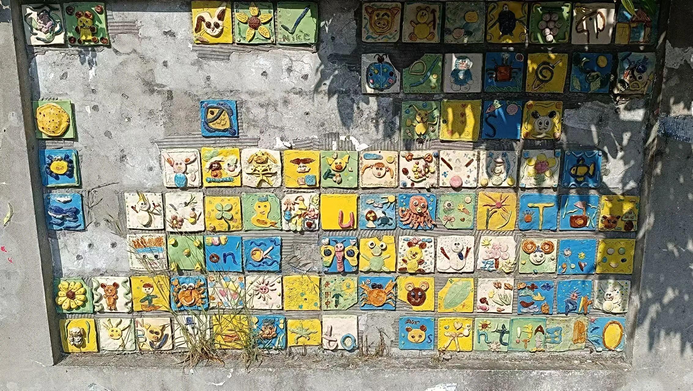 原图展示了一面墙壁装饰,由多块彩色方形瓷砖组成,每块瓷砖上都有不同的图案和色彩。核心元素包括方形的几何结构、丰富的色彩搭配如黄色、蓝色和绿色,以及每块瓷砖上独特的图案设计。去除复杂的具体图案,保留整体的几何排列和色彩对比。