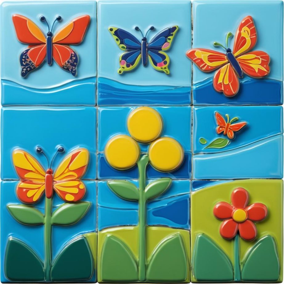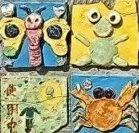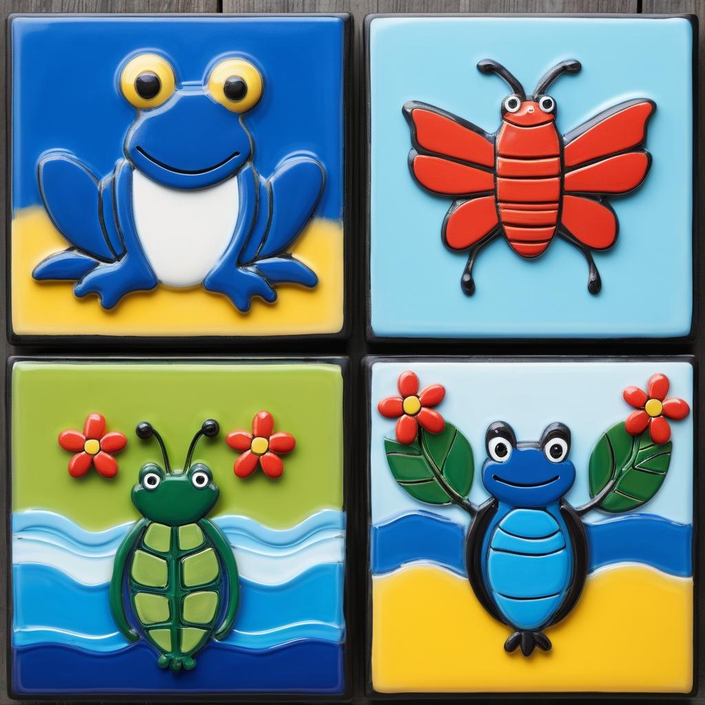 这幅作品展示了四个色彩鲜艳的手工陶艺拼贴,每个拼贴包含不同的生物形象:蝴蝶、青蛙、螃蟹和一个人形。作品使用了丰富的色彩和粗犷的线条,营造出一种童趣盎然的氛围。背景颜色的对比使每个生物形象更加醒目,传达了一种自然与儿童天真的结合。