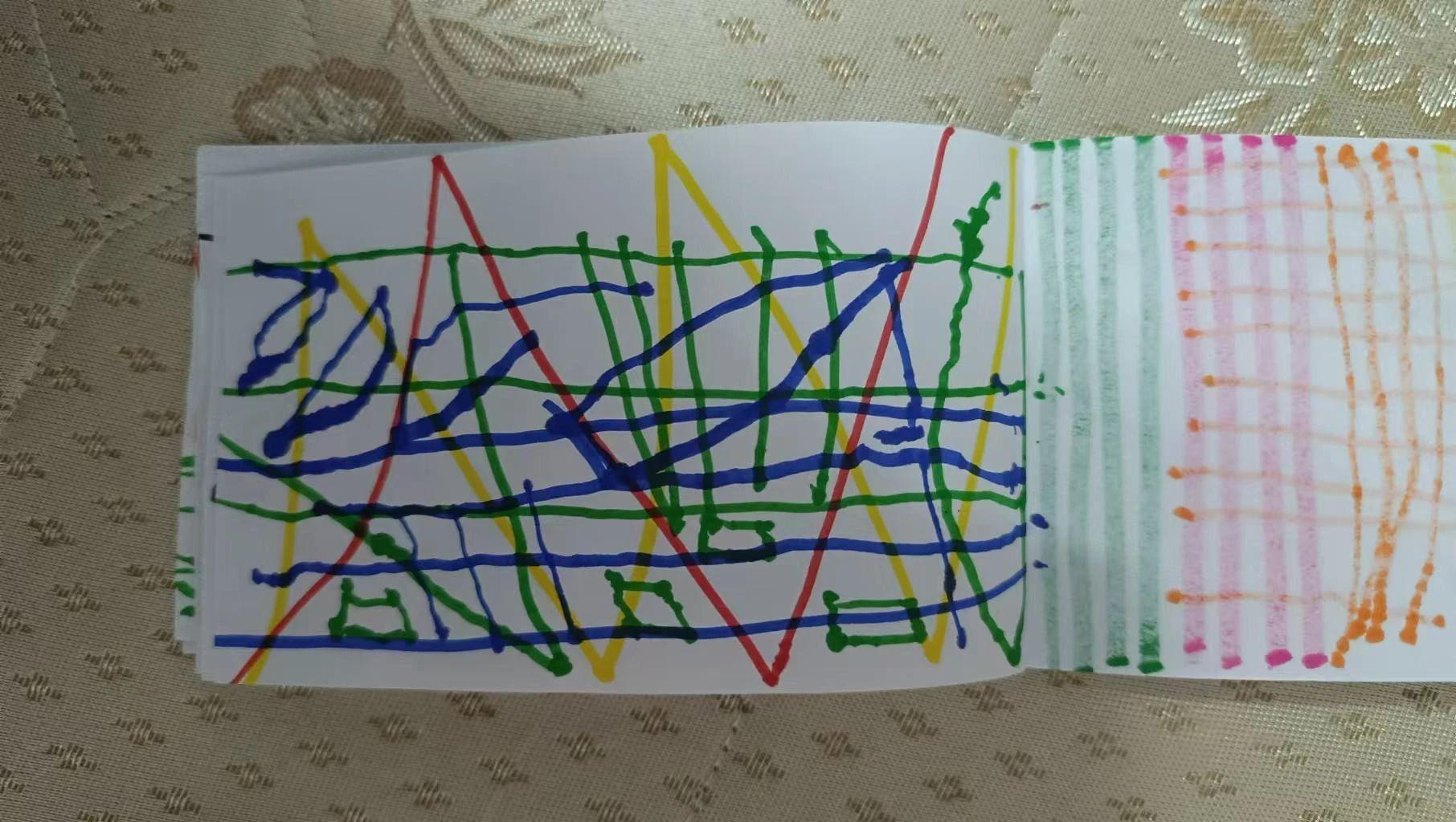 这幅作品充满了色彩和线条的交错,使用了蓝色、绿色、红色和黄色的线条在白色背景上构成一种网格状的结构。画面的左侧还有紫色和橙色的条纹,形成对比。这种图案可能传达了活力和自由,但同时也有些许混乱感,可能表达了孩子的纯真与创造力。