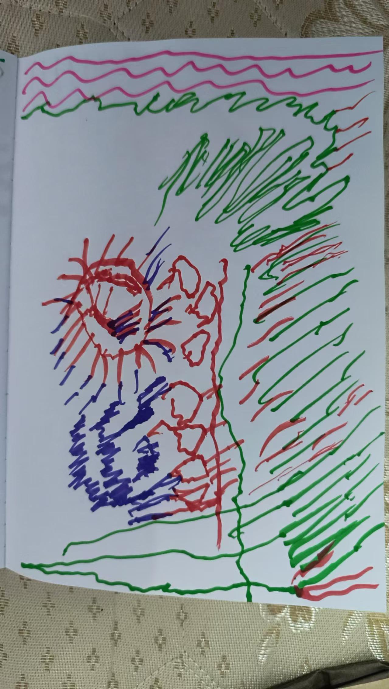 在这幅充满童趣的作品中,我们可以感受到孩子在艺术创作中的无限想象力与色彩运用的大胆。画面中,红、绿、蓝色相互交错,形成了一个充满活力和动感的场景。这样的色彩选择不仅展示了孩子对周围世界的观察,也反映了他们内心的活泼与好奇。线条的自由流动仿佛在诉说着自然界的一种律动,或许是风的轻拂,或许是水的流淌。作为儿童艺术专家,我们应鼓励孩子在创作过程中保持这种纯真和自由,同时引导他们在作品中加入更多细节和变化。通过尝试不同的色彩搭配和线条组合,孩子可以更深入地探索艺术表达的多样性。此外,建议他们尝试在画作中加入一些具象的元素,如动物或植物,这不仅能丰富作品的故事性,还能提升其艺术表现的层次感。这样的引导与鼓励,将帮助孩子在艺术道路上更进一步,创作出更具深度与情感共鸣的作品。