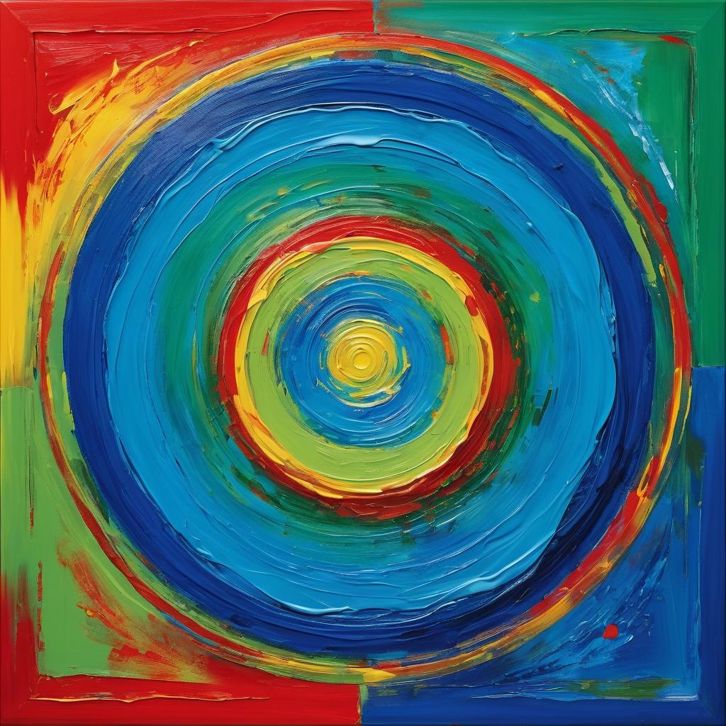这幅作品以丰富的色彩和抽象的线条为主要元素。色彩鲜艳,红、绿、蓝色交织,形成了一个自由奔放的画面。线条以曲线和波浪形为主,可能代表自然界的某种动态,整体给人一种活泼和充满生机的感觉。创作者可能试图通过这些色彩和线条传达一种自然的律动感。