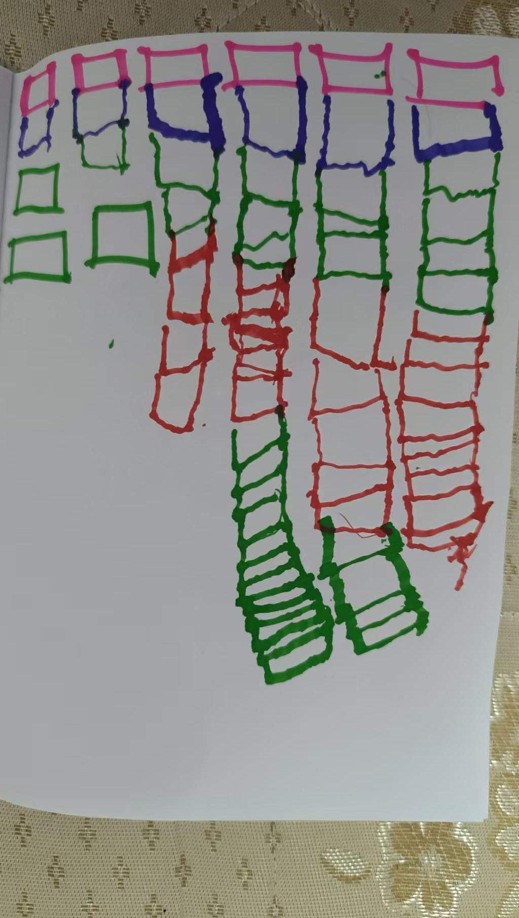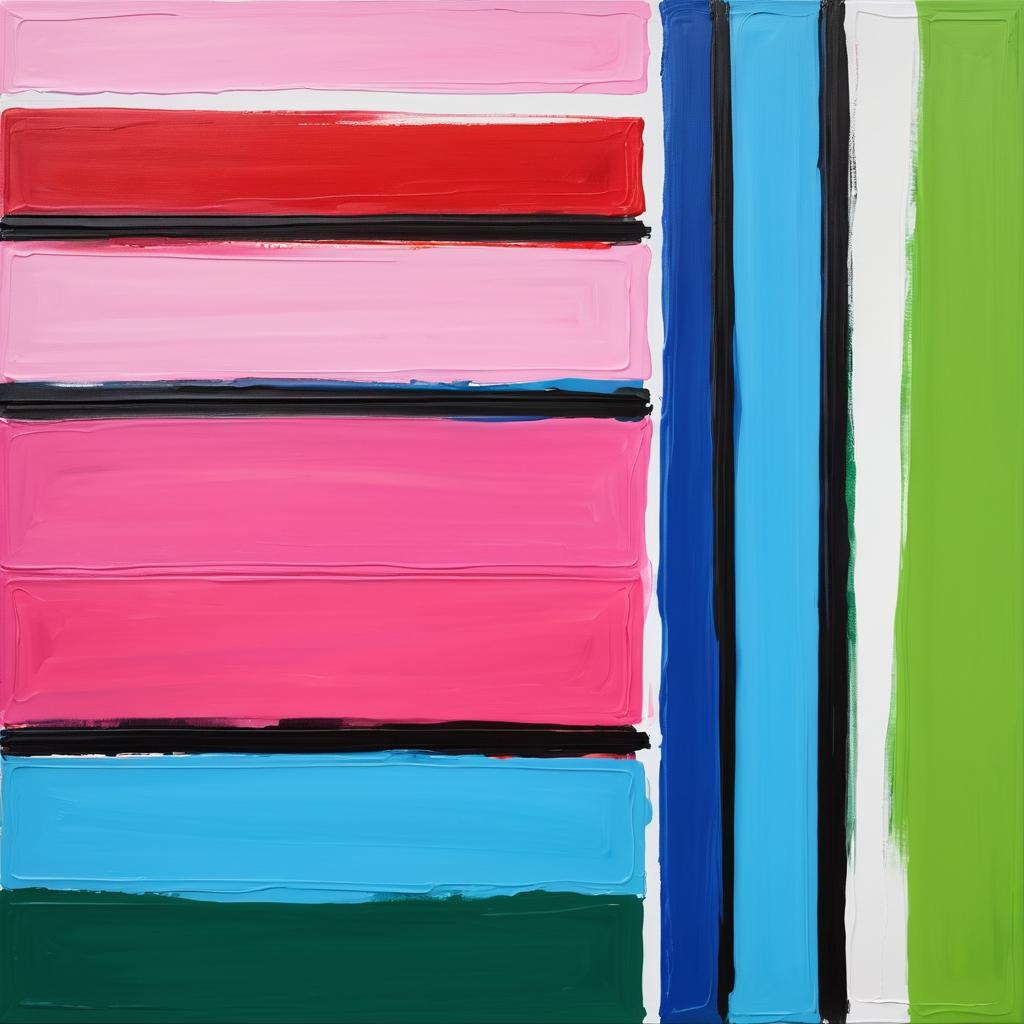 这幅作品通过简单的形状和鲜明的色彩,展现出一种童趣和创造力。粉红色、蓝色、绿色和红色的矩形和线条交织在一起,形成一种既有序又自由的氛围。这种布局不仅激发了观众的想象力,还让人反思秩序与混乱之间的微妙关系。