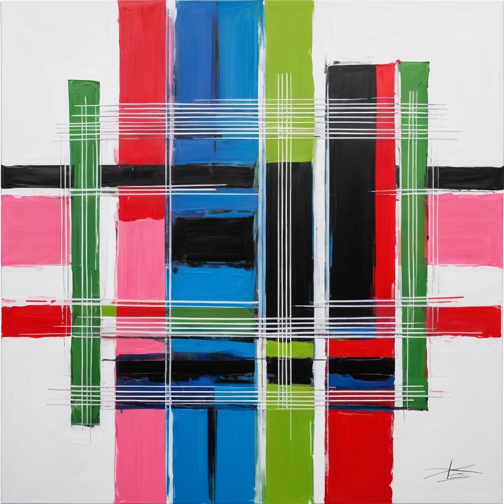 这幅画作使用了鲜明的颜色,包括粉红色、蓝色、绿色和红色,绘制了多个矩形和线条的组合。这种图案给人一种有序与自由结合的感觉,可能传达了创作者对秩序与混乱之间关系的思考。整体布局呈现出一种抽象和现代感。