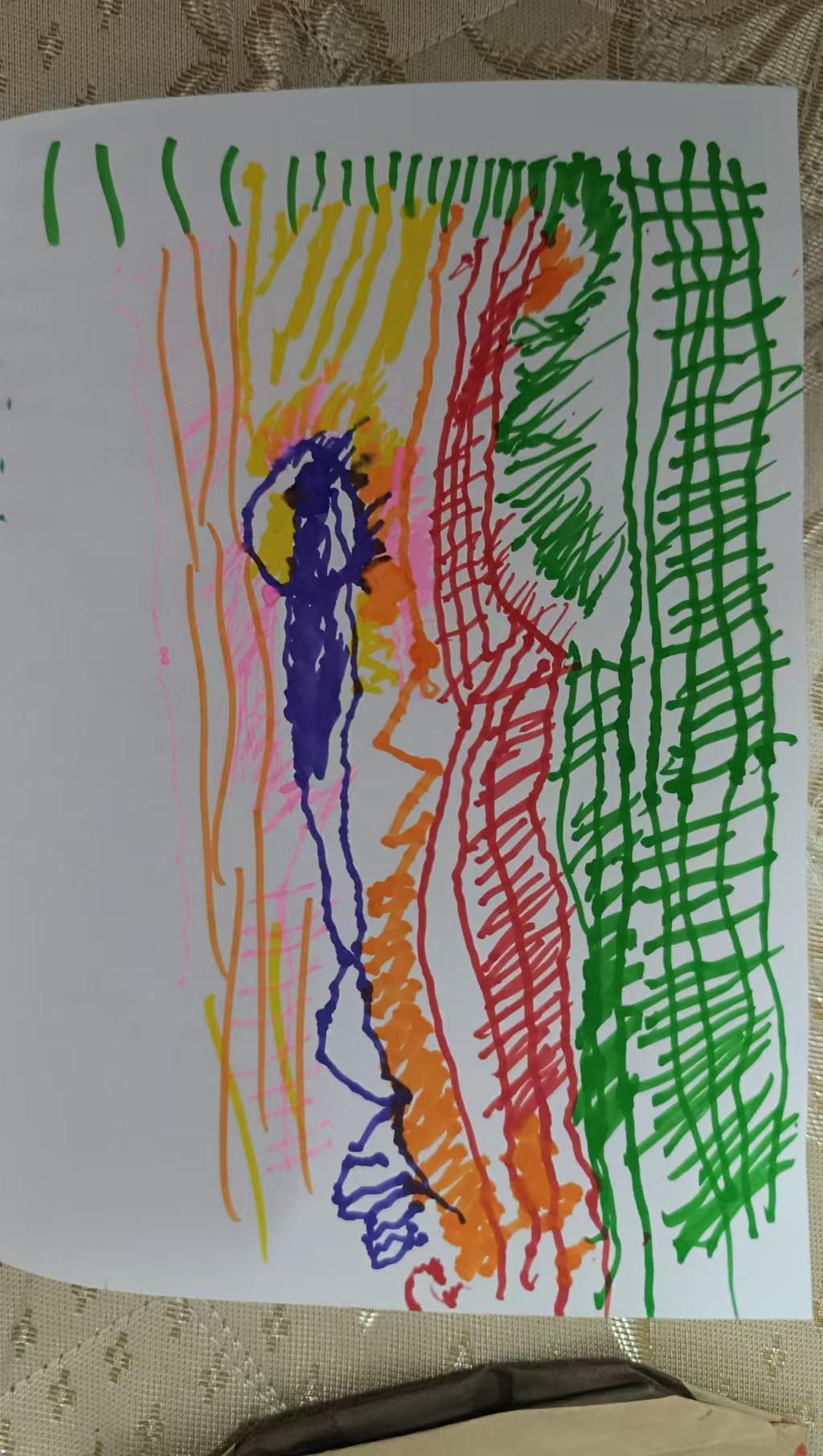 在这幅充满童趣的作品中,我们看到了色彩与线条的自由碰撞。绿色、黄色、橙色、红色和紫色等多种色彩的运用,让画面充满了生机与活力。这种色彩的大胆运用,常常出现在儿童的画作中,因为它们没有被固定的规则所束缚,能够自由表达内心的想法和情感。画面中的线条交错,仿佛在诉说着某种故事,尽管内容模糊,但却充满了想象的空间。作为一名儿童艺术专家,我建议在保留这种自由表达的前提下,加入更多的细节设计,比如在色块中添加渐变效果,或者在线条中引入一些图案元素,这将使作品在保持童趣的同时,增加艺术的深度和复杂性。通过这些改进,作品不仅仅是简单的色彩游戏,而是能够引发观者深思的艺术表达。