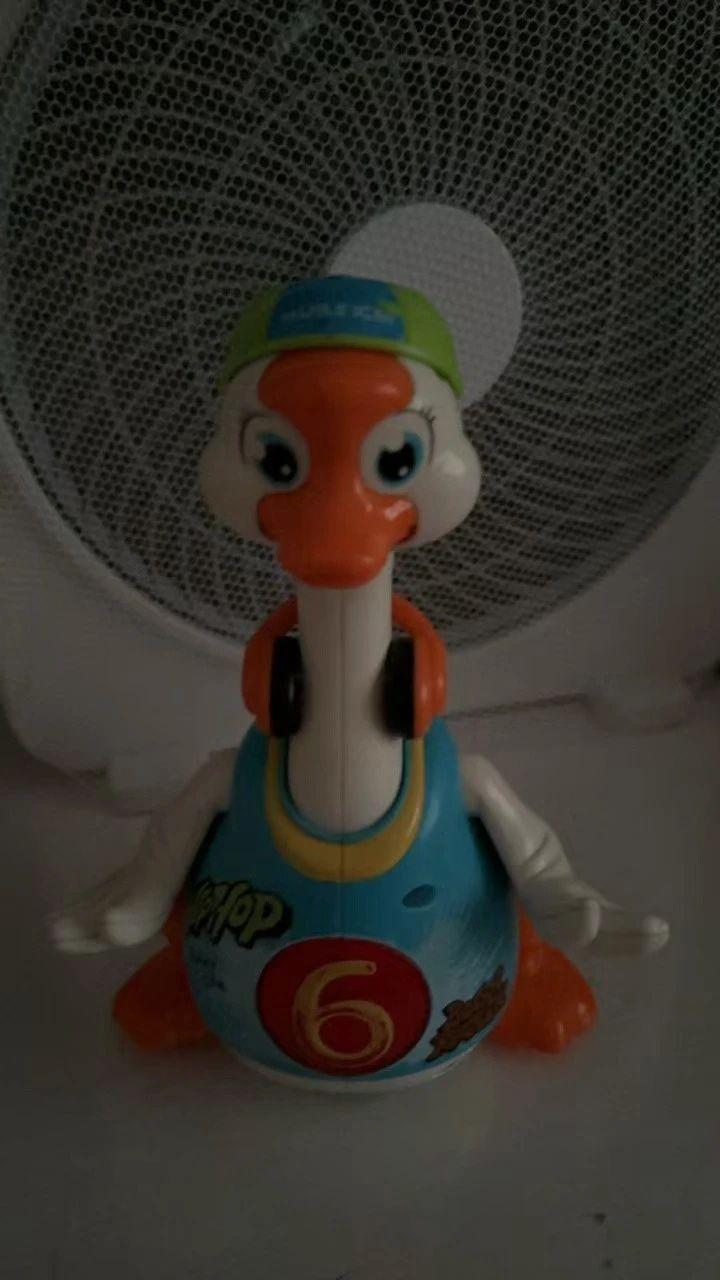 這幅作品的主要元素包括一個卡通風格的鳥形玩具,明亮的藍色和橙色是畫面的主要色彩。構圖中,玩具被放置在畫面中央,背景是一個圓形的網狀圖案,可能是電風扇。整體情感偏向於幽默和輕鬆,帶有玩樂的氣息。