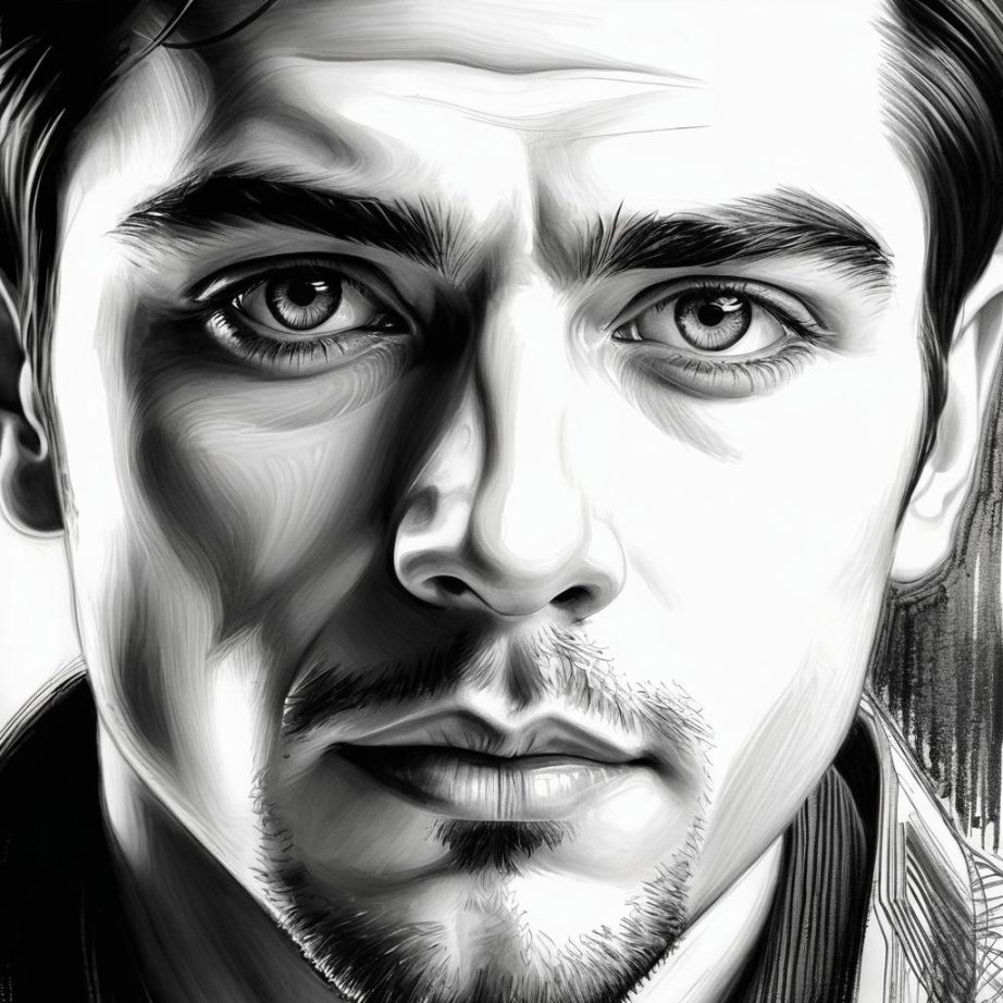 这幅素描作品主要以黑白灰为色调,突出了人物的面部特征和表情。通过细腻的阴影处理,画面表现出一种宁静与深思的氛围。创作者通过细致的线条刻画和对光影的掌控,成功地传递了人物的个性和内在情感。