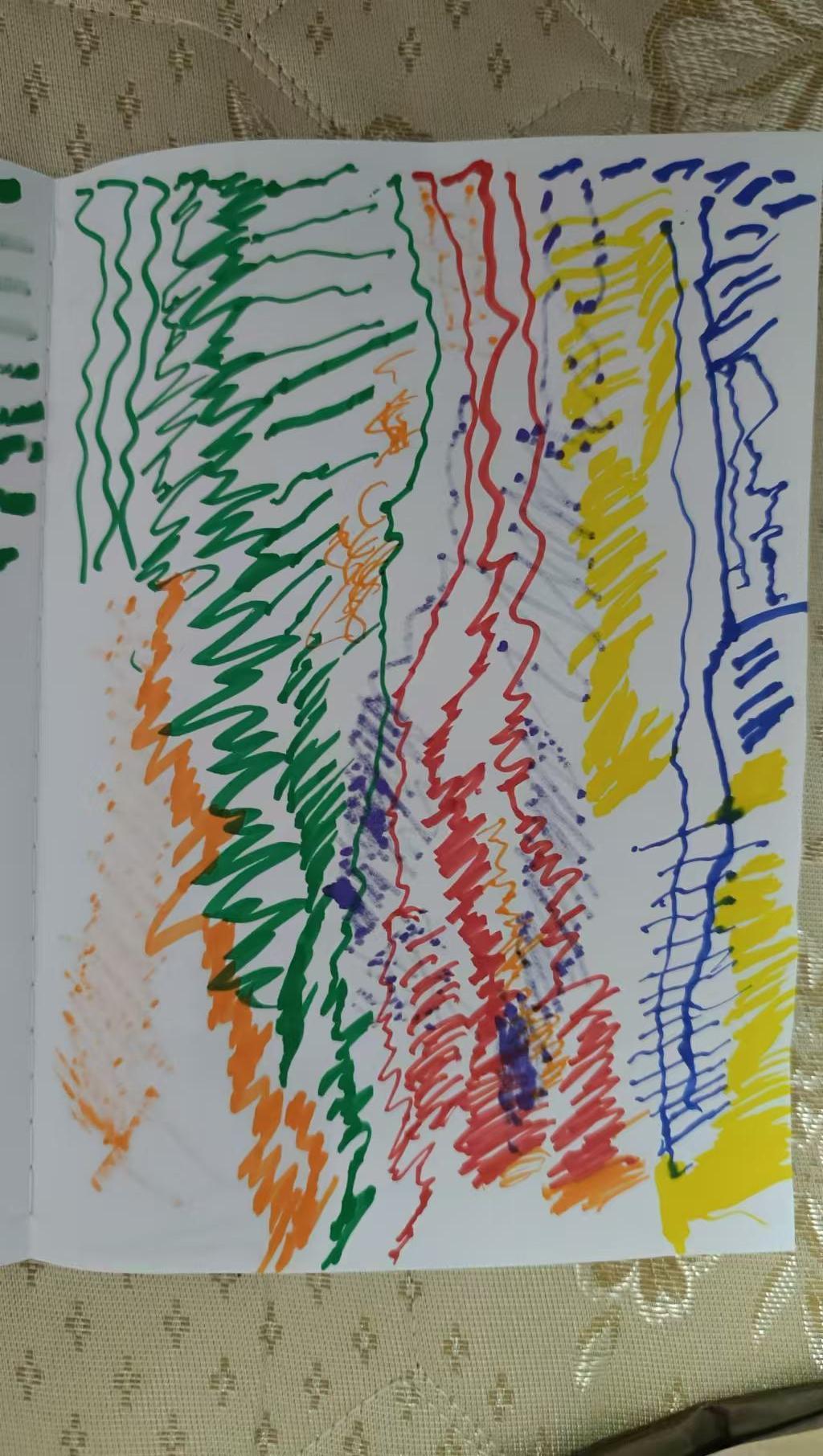 这幅画作展示了多种颜色的波浪形线条,包括绿色、橙色、红色、黄色和蓝色。线条以垂直的方式排列,表现出一种动态和自由的感觉。画作给人一种活泼和随意的氛围,可能表达了艺术家对色彩和形状的探索和实验。