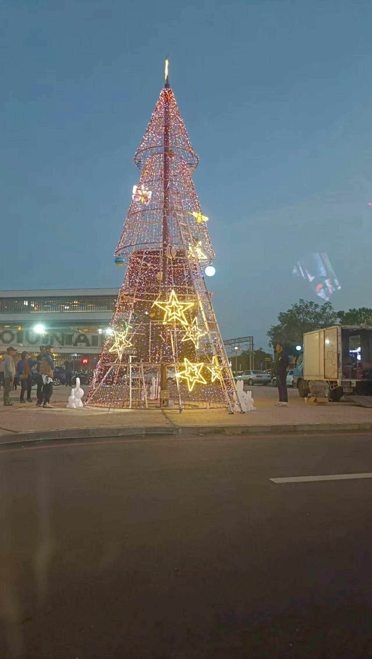 图片展示了一棵装饰有灯光的圣诞树,周围有一些人物。圣诞树被多层次的灯光装饰,形成了星星形状的亮点,营造出浓厚的节日氛围。背景中还有建筑物和车辆,显示出城市环境。光影效果主要来自于灯光本身,与蓝色的天空形成鲜明对比。整体构图集中于圣诞树及其装饰。