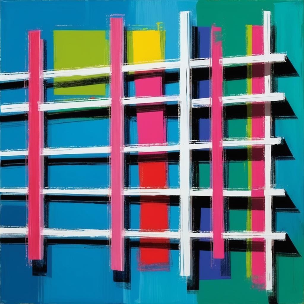 这幅作品由不同颜色的矩形和线条组成,主要颜色包括粉色、蓝色、绿色和红色。每种颜色的矩形排列成列,线条连接着这些矩形,形成一种梯子的形状。整体构图简单而富有节奏感,可能表达一种秩序与探索的主题。