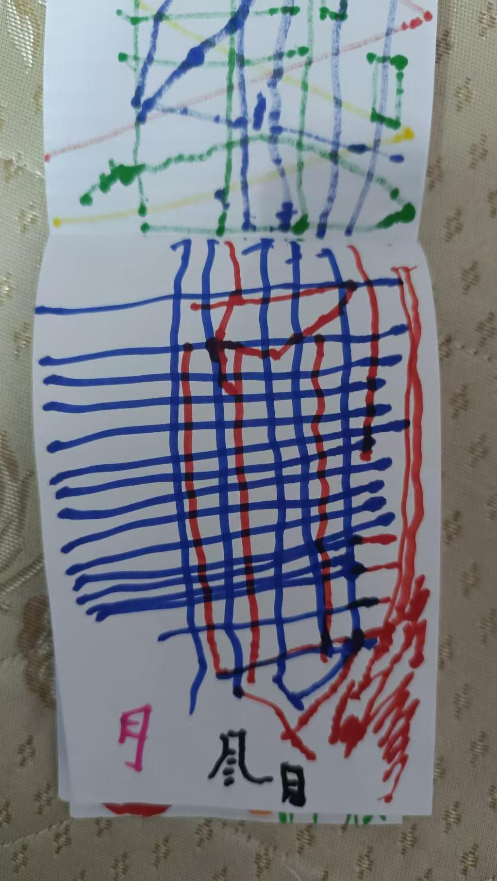 这幅作品由多种颜色的线条构成,主要以红色、蓝色和绿色为主,形成了一个交错的网格图案。背景较为简单,线条的粗细不一,表现出一种随意和自由的创作风格。底部似乎有一些手写的文字,增添了作品的个性化和即兴感。整体给人一种活泼和富有活力的印象。