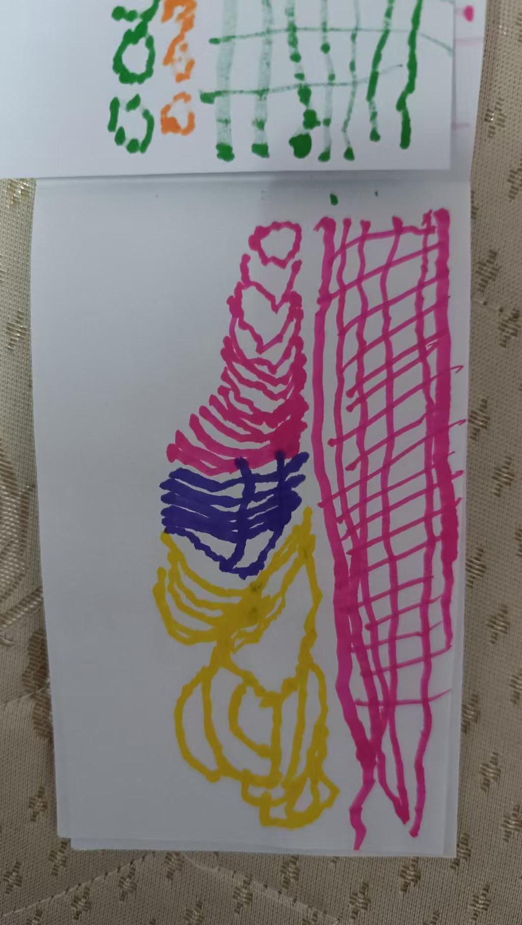 在这幅色彩斑斓的作品中,作者通过简单的线条和图案,成功传达出一种自由和快乐的情感。色彩的多样性和大胆的运用显示了创作者的想象力和勇气。粉色和黄色的结合为画面增添了温暖,而蓝色和绿色则提供了一种清新的对比。通过这幅作品,我们能够感受到创作者对色彩的探索和对艺术表达的热情。孩子们的艺术创作往往是最纯粹的情感流露,他们通过简单的笔触,表达出内心的世界。这样的作品不仅让人愉悦,也启发我们去思考色彩与情感之间的关系。为了让这样的作品更具吸引力,可以尝试在背景中加入渐变或者纹理,增加画面的层次感。此外,适当引入一些具体的形象,如抽象的小动物或自然景观,可以增加作品的趣味性和想象空间,使观众能够更深刻地体验到这份创作的乐趣。
