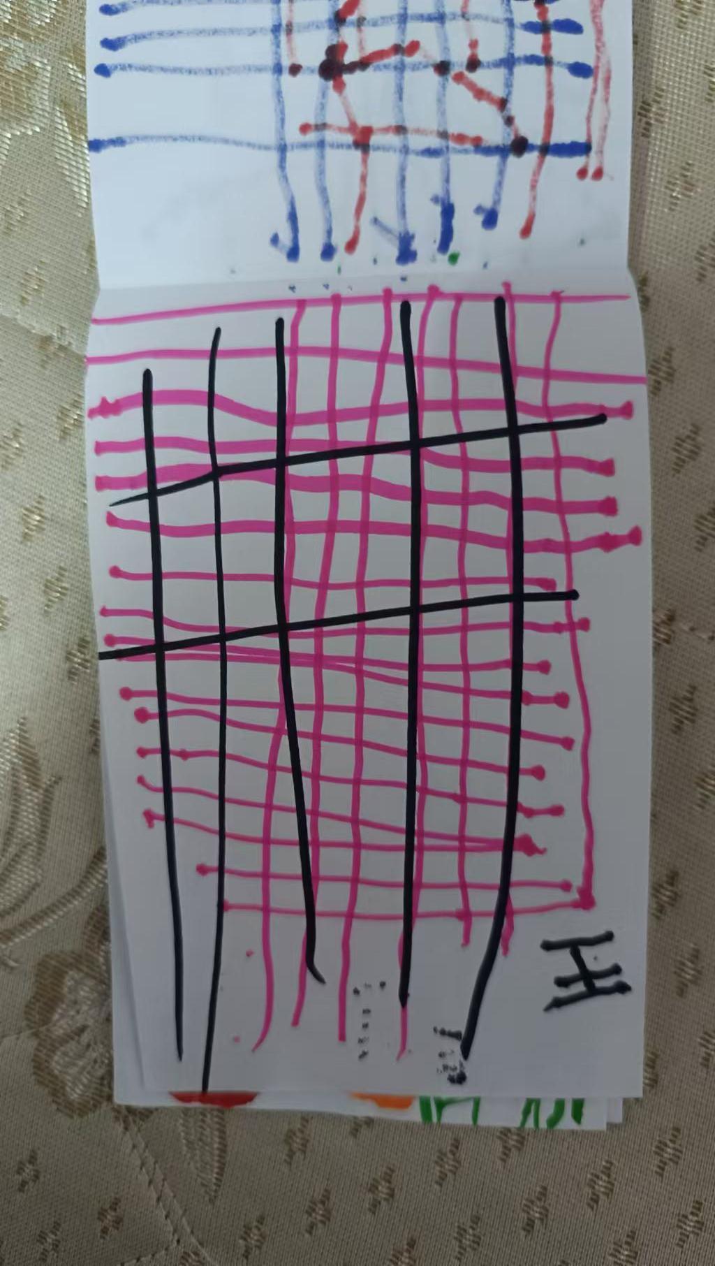 这幅作品充满了童真的活力和创造性。粉色和黑色的对比加强了视觉的冲击力,线条的随机排列则体现了孩子们对世界的独特理解和表达方式。为了提升这幅作品,可以考虑加入更多的色彩和线条变化,增加作品的层次感和细节。同时,可以通过引入一些简单的形状或图案(如圆圈或三角形),增强作品的趣味性和深度。这将使作品在颜色和构图上更加丰富,并为观众提供更多的想象空间。