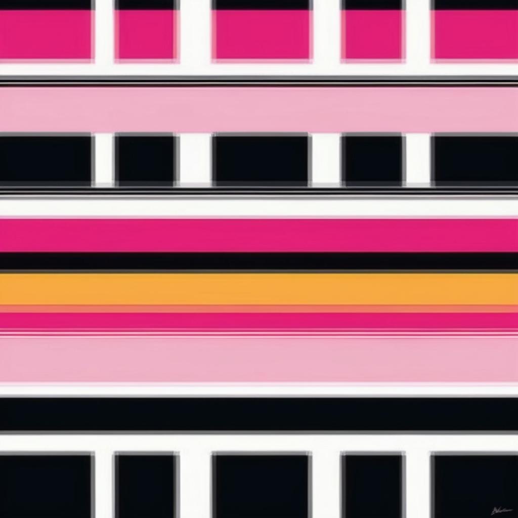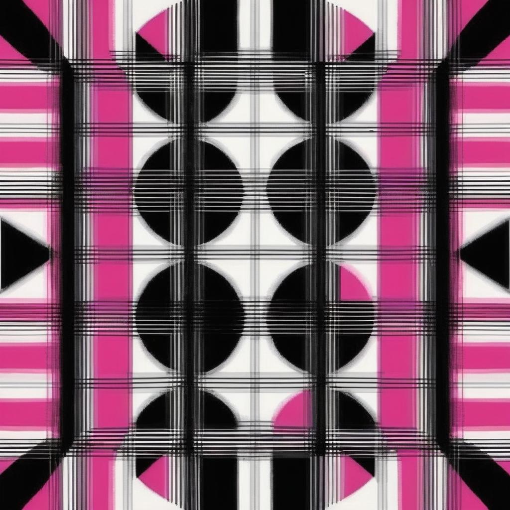 在这幅作品中,我们看到了一个由粉色和黑色线条组成的网格图案。它简单却不失深度,线条的不规则交错形成了一个动态的视觉结构。这种设计不仅仅是对颜色和线条的探索,更是对秩序与混沌之间微妙平衡的探讨。作品上半部分的图案略有不同,它们以不同的颜色和形状呈现,增加了作品的丰富性和趣味性。