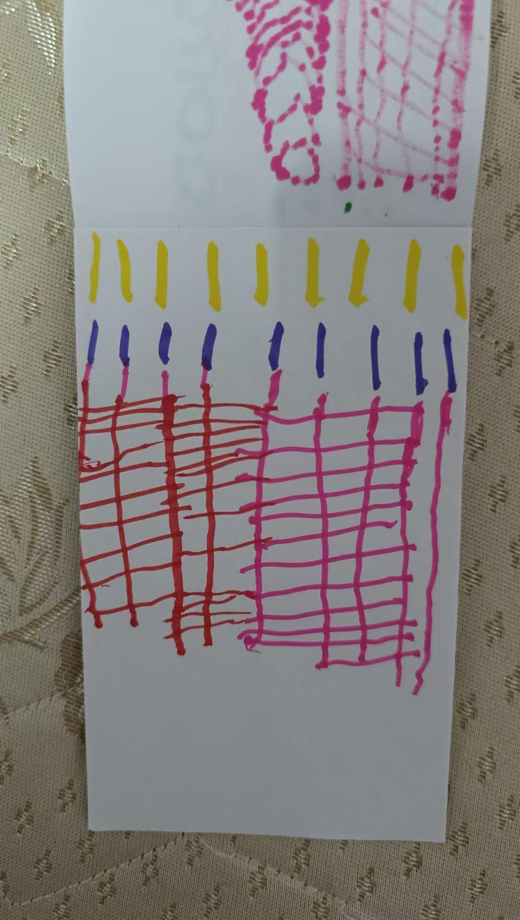 这幅作品通过简单的线条和鲜明的色彩,展现了孩子眼中的世界。黄色、紫色、红色和粉色的交错线条构成了一种网格状的图案,仿佛是在无拘无束地表达他们的梦想和想象。这样简单而富有表现力的创作过程,不仅是孩子们理解和探索世界的一种方式,更是他们通过作品与他人分享内心感受的途径。