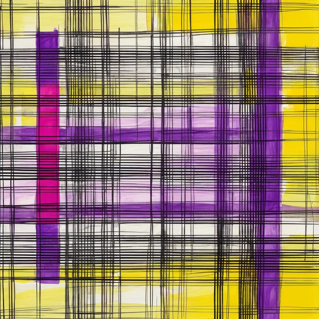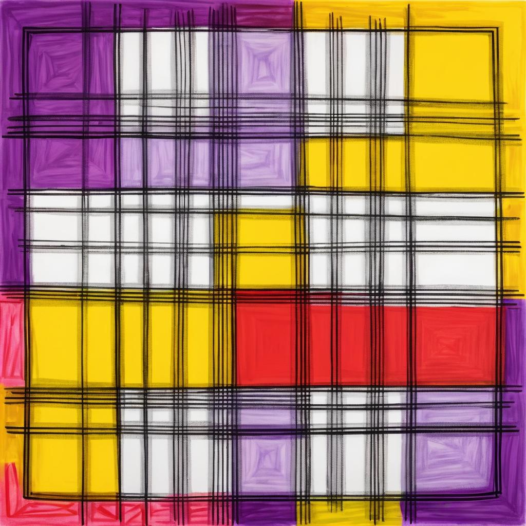 这幅作品使用了鲜艳的颜色和简单的线条构成。黄色、紫色、红色和粉色的线条交错排列,形成了一种网格状的图案。画面给人一种童趣的感觉,可能反映了创作者对色彩和形状的初步探索。