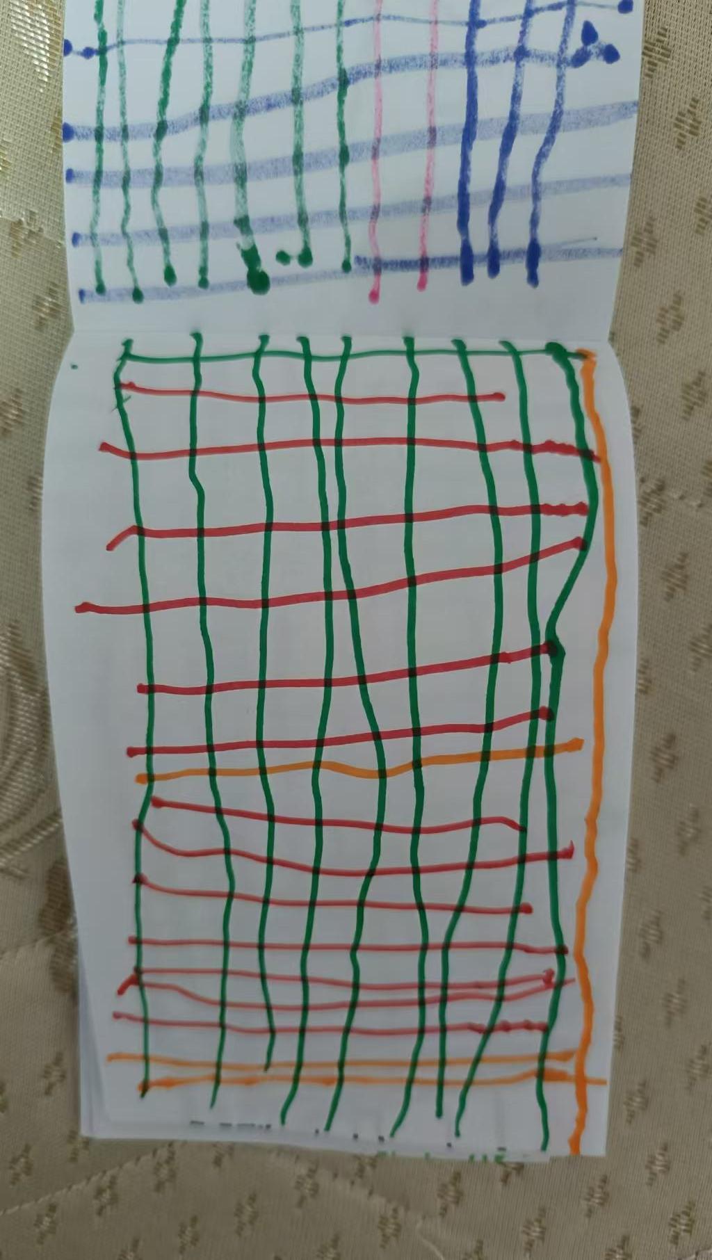 在儿童艺术创作中,线条与色彩的运用往往反映出一种纯真和直接的艺术表达。这幅作品通过简单的网格图案,展示了丰富的色彩组合。绿色、红色、蓝色和橙色的线条交错排列,形成了一种视觉上的和谐与对比。儿童在创作这样的作品时,通常会以直观的方式表达他们的感受和想象力,而不拘泥于形式上的限制。