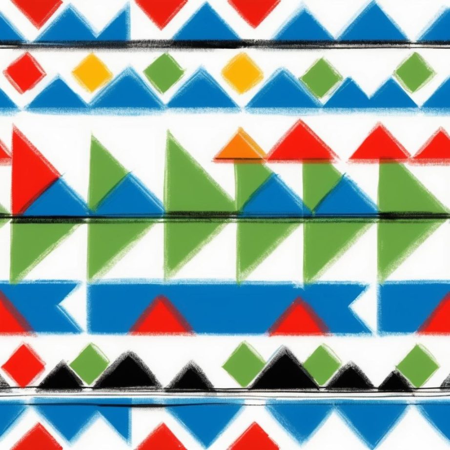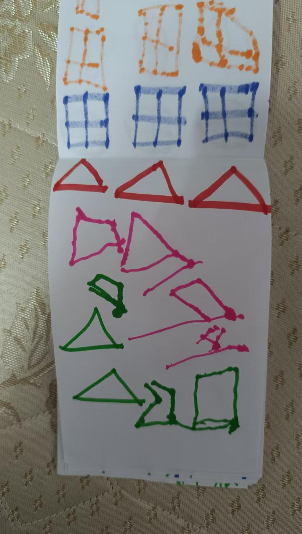 这幅图片展示了一些用彩色笔绘制的简单几何图形,包括方形和三角形。这些图形以橙色、蓝色、红色和绿色为主,排列在白纸上。整体构图显得随意而富有童趣,可能是儿童的创作。图形的排列没有明显的规律,给人一种自由和探索的感觉。