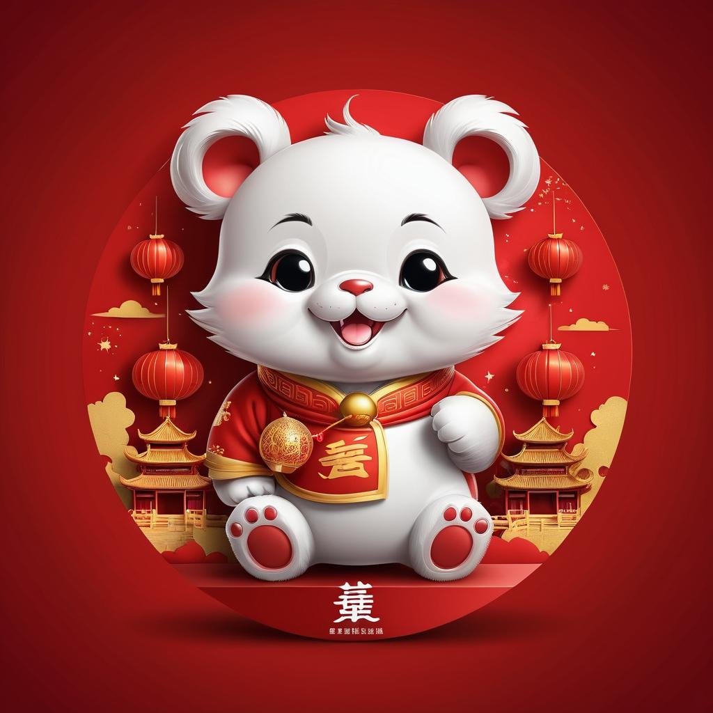 这幅作品展示了一只可爱的卡通生物,具有圆润的身体和迷人的表情。背景是传统的中国红色,象征着吉祥和喜庆。图中生物的线条简洁,却富有表现力,传达出一种轻松愉悦的情感。作品可能意在表达新年的欢乐和希望。