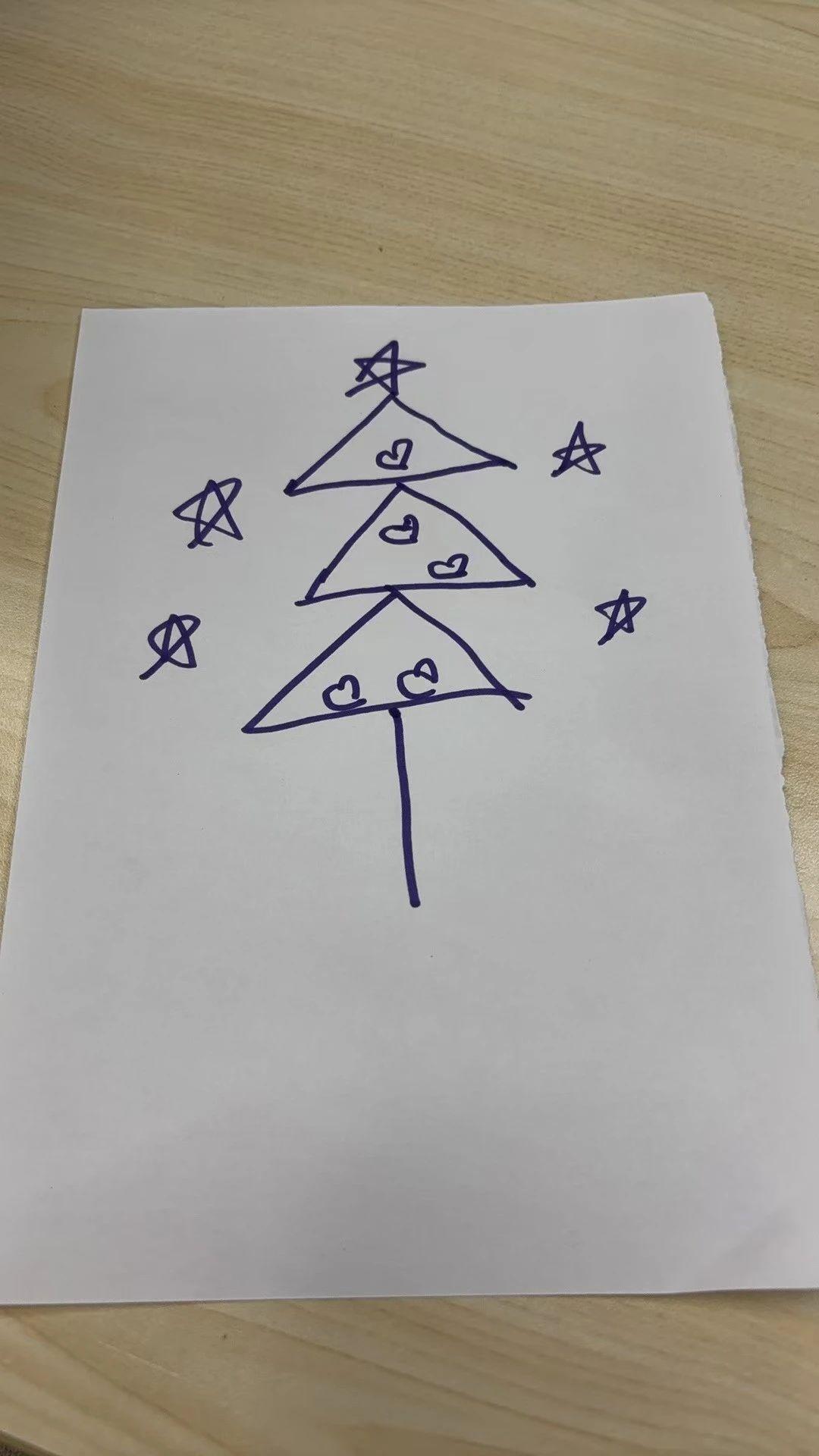 这是一幅简单的手绘作品,描绘了一棵圣诞树的抽象形象。树由三角形组成,每个三角形内含有心形图案,顶部和周围点缀着星星。整体构图简洁,采用了手写的线条风格。缺乏复杂的光影和色彩运用,但星星和心形图案可转化为节日氛围的元素。