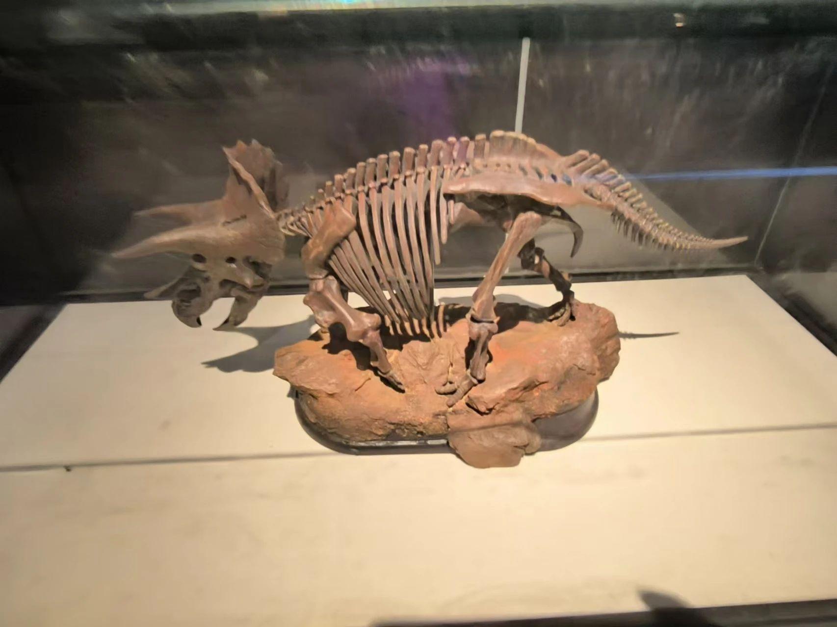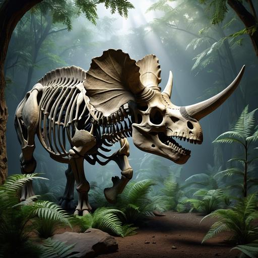 这幅作品展示了一个三角龙的骨架标本,摆放在博物馆的展示柜中。作品的颜色主要是棕色与灰色,突显出骨架的历史感。构图上,骨架呈横向延伸,强调了恐龙身体的长度和体积感。灯光打在标本上,形成了一种神秘而庄重的氛围,似乎在诉说着远古时代的故事。情感表达上,这幅作品唤起了人们对史前生命的敬畏与好奇。